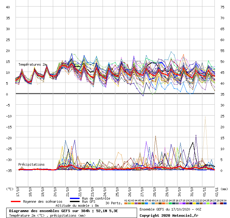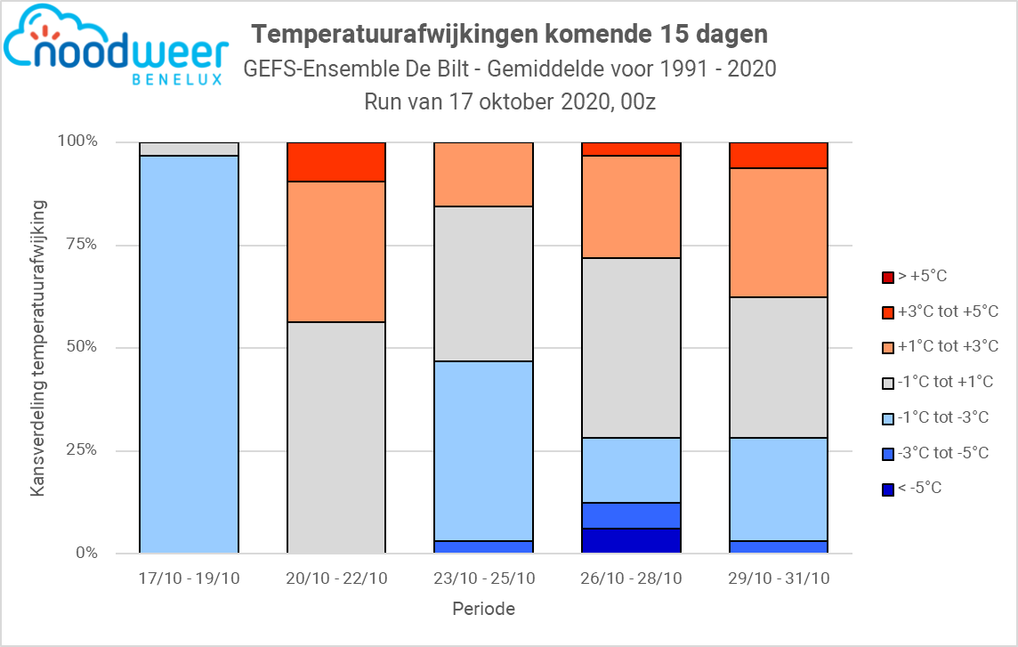 Op basis van het GEFS Ensemble van vanochtend blijven de kansen op veel hogere en/of veel lagere temperaturen dan normaal vrij beperkt de komende twee weken. Het gemiddelde is hierbij overigens van 1991 - 2020, dus iets zachter dan het huidige gemiddelde.