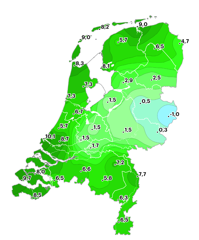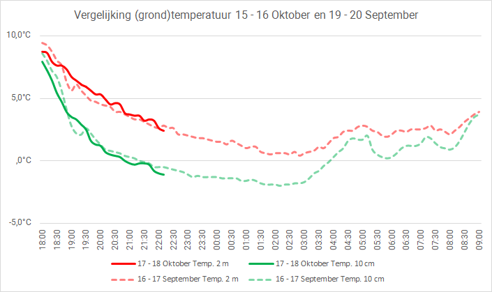 Het is hier in Rotterdam nog zo'n 9 graden aan de grond, terwijl het KNMI-Station Cabauw (zo'n 25 km verderop) een temperatuur van 1,5 graad aangeeft op 10 cm hoogte. Maar goed, er is nog tijd komende nacht om het te laten afkoelen.