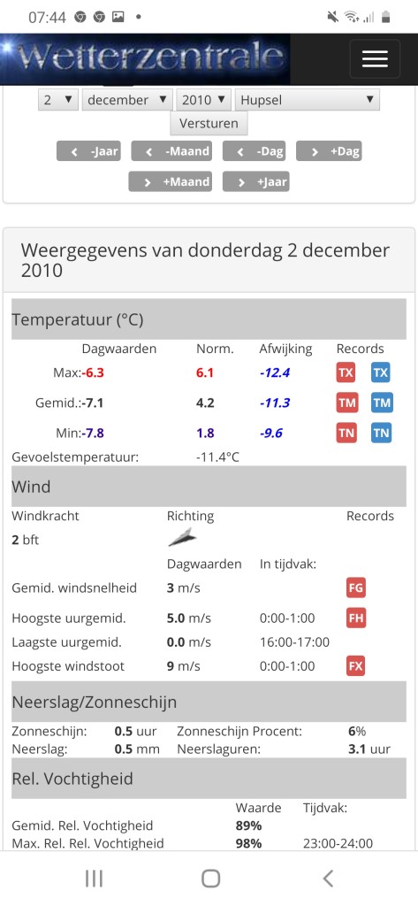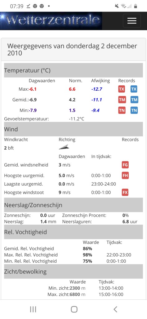 Stellen van het dagrecord. Ik heb het dan over 2 december 2010. En het was mijn 50e volbrachte levensjaar. Wat een dag toen. Een verkeersinfarct in Nederland door de sneeuw. Eerst de Bilt en als toetje Hupsel..het dichtst nabij gelegen weerstation.