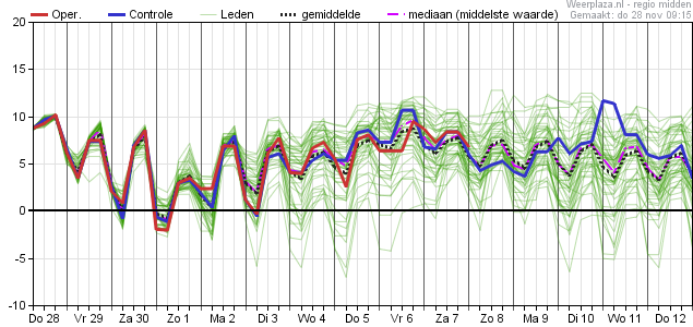 Op 17 november toonde het gemiddelde voor 1 december een temperatuur van 10 graden, er waren slechts enkele opties voor vorst. Uiteindelijk een graad of 5 met lichte vorst in de nacht.