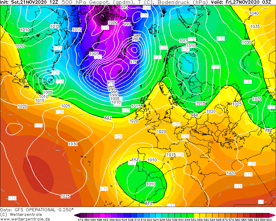 Eerste push met WAA richting het noorden is er gekomen; er zijn vrij hoge drukwaarden boven onze omgeving met uitbreiding naar Scandinavië. Het lagedrukgebiedje nabij New Foundland zou dan het volgende 'zetje' moeten gaan geven én zorgen voor een duikende straalstroom (lagedrukgebieden MZ-gebied). Voorlopig on-track met GFS06z en ECMWF00z.