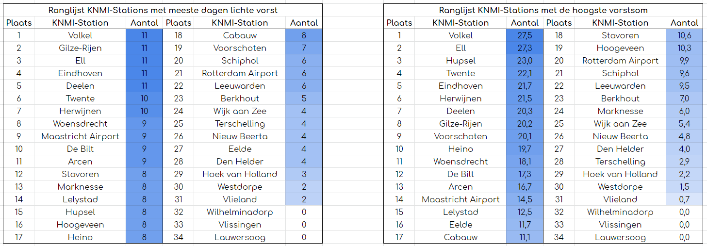Opvallend is dat Woensdrecht al negen vorstdagen heeft, terwijl Wilhelminadorp (zo'n 35 km hemelsbreed) er nog geen een heeft. Verder staan ook Vlissingen en Lauwersoog nog 'droog'. Wat verder opvalt is dat Stavoren vrij hoog staat (8 vorstdagen) ondanks de invloed van het IJsselmeer.