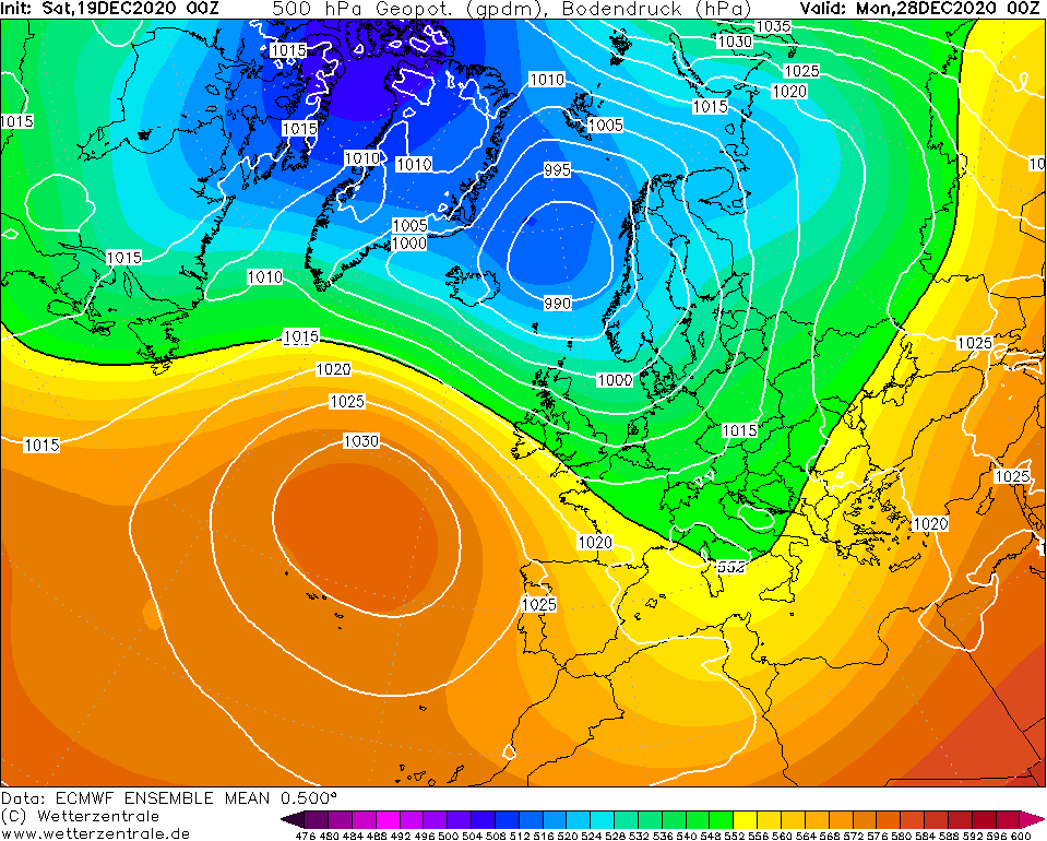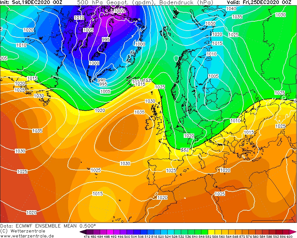 - Zwak signaal daarna voor een nieuwe rug. Maar het EPS gaat hier nog niet overtuigend in mee en blijft hoofdzakelijk met een zwak golvende westelijke stroming zitten met hogedruk ten westen en lagedruk ten noorden van ons.