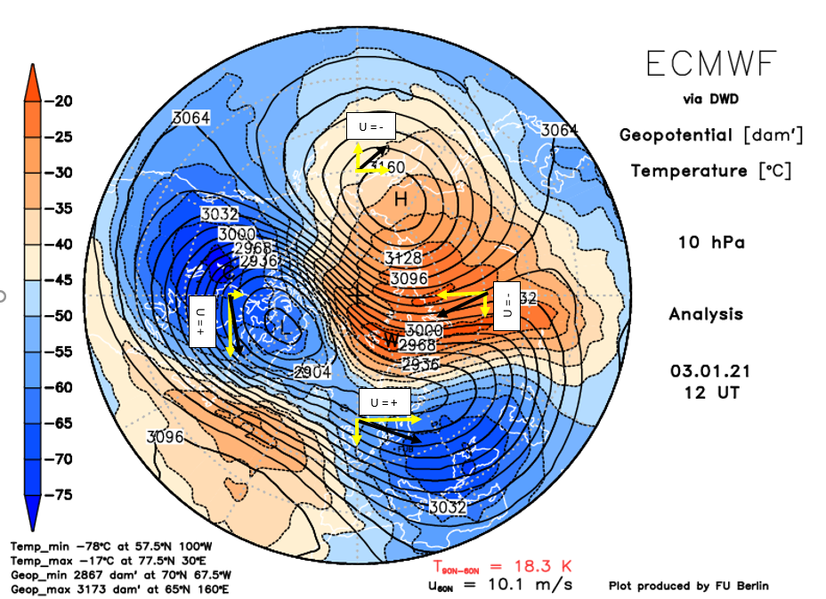 Het snelle afnemen (en eventueel toenemen) van de zonaal gemiddelde zonale wind komt dus niet alleen door de sterke van de vortex (of: vortexrestant) maar ook door zijn positie. Het is belangrijk om naar het hele hoogteprofiel en de kerntemperatuur van de vortex te kijken, want dat is de energie waar de vortex op teert, figuurlijk gesproken.