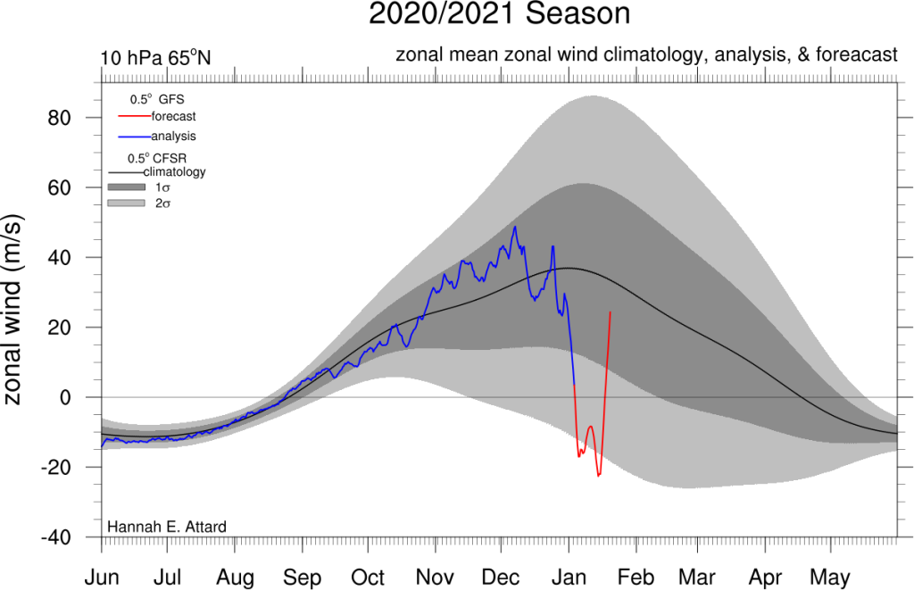 Om tot een SSW te komen moet dus het gemiddelde van alle zonale componenten over een bepaalde breedtegraad (bijvoorbeeld 60 of 65NB) negatief zijn. En negatief betekent in ons assenstelsel hierboven dat de vectoren naar links wijzen. Dit gemiddelde is wat je ziet op de grafieken die wij hier vaak laten zien, zoals onderstaand voor 65NB.