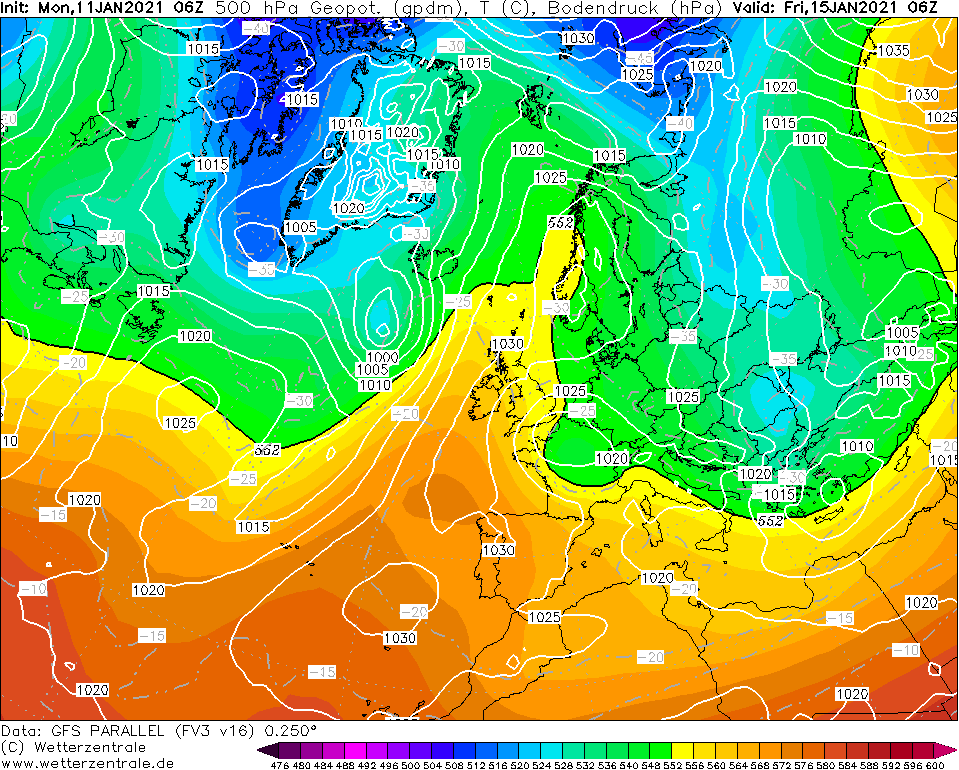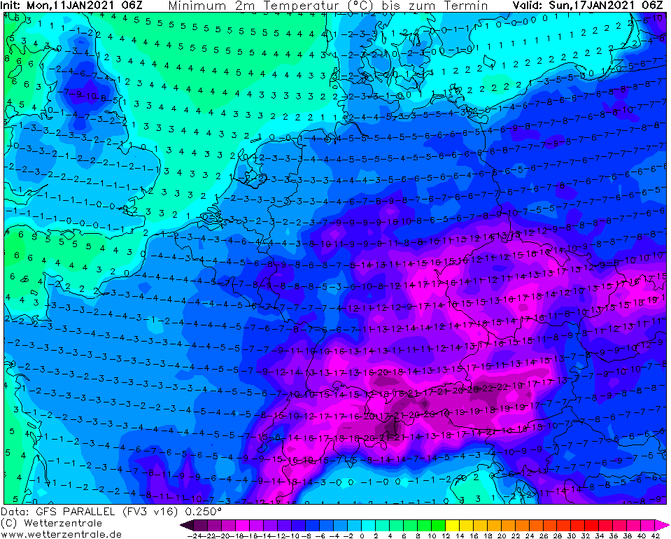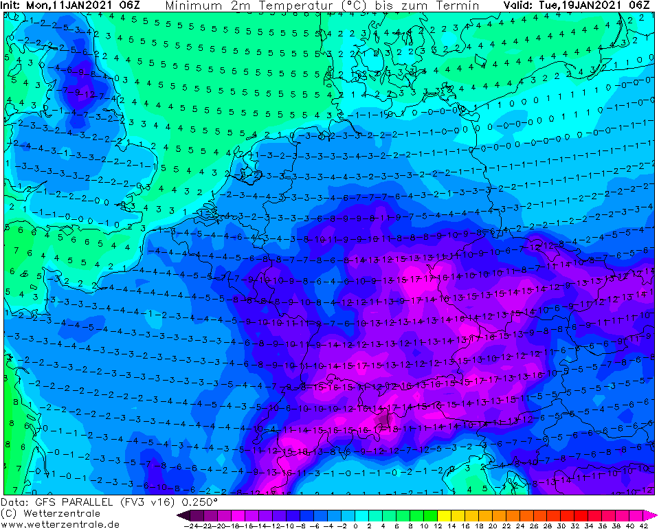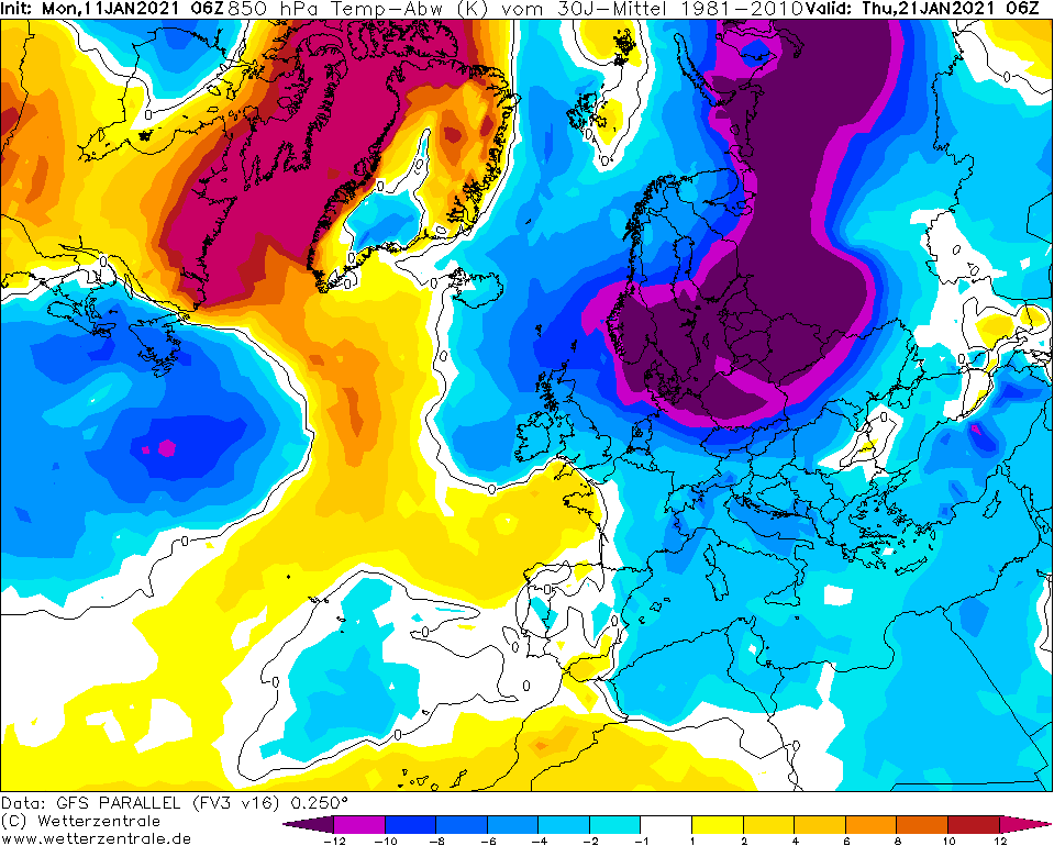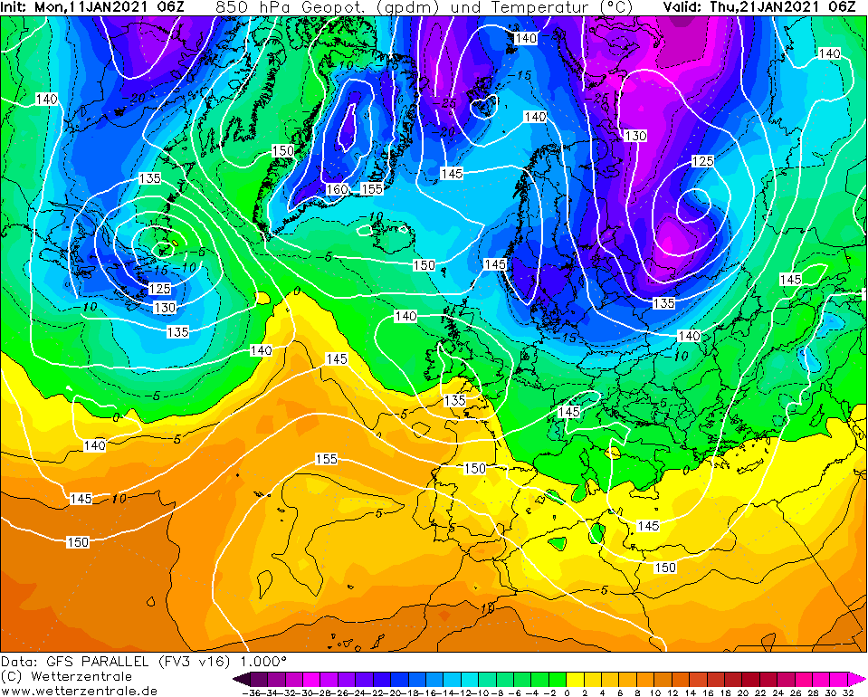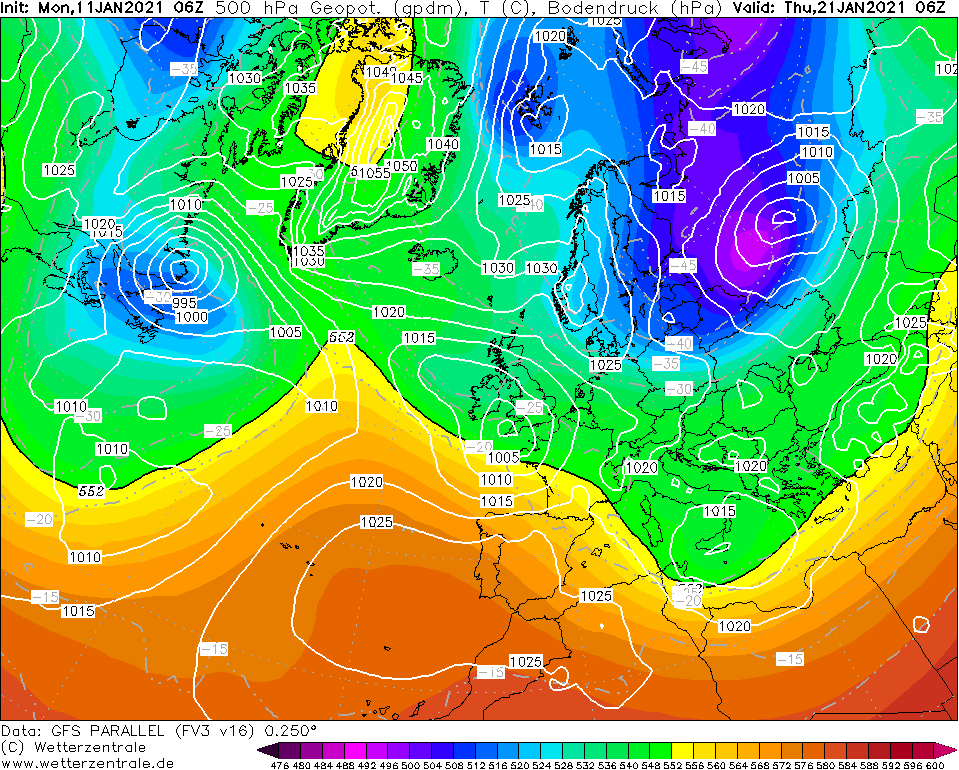 Zowel op de MLT als op de ULT. Vanaf donderdag continu een zwakke stroming en vaak ook aflandig, waardoor het minstens een week lang licht tot matig blijft vriezen in de nacht en ochtend en overdag komt er geen echte verzachting met maximaal temperaturen van zo'n 2 graden boven het vriespunt. Daarbij ligt het dauwpunt dan vaak tussen de -5 en -10 graden. Op de ULT ook bijzonder mooie kaarten als je het mij vraagt met een enorme bel koude lucht boven Scandinavië en Oost-Europa. Ik zou hier sowieso mijn handtekening onder zetten mocht dat kunnen...