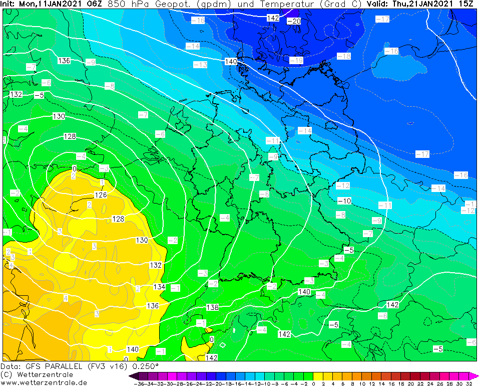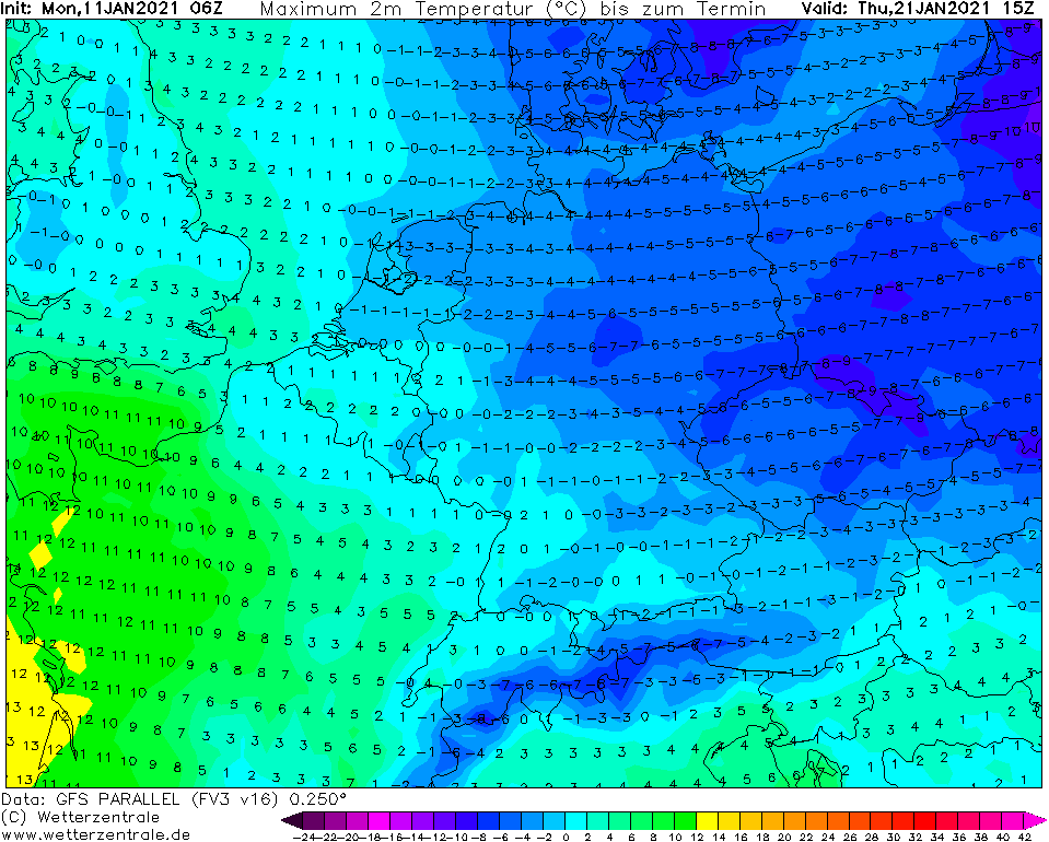 Een 'battle' tussen de ijskoude lucht in het noordoosten en de zachte lucht in het zuidwesten pal boven de Benelux. Betrouwbaarheid uiteraard zeer laag.