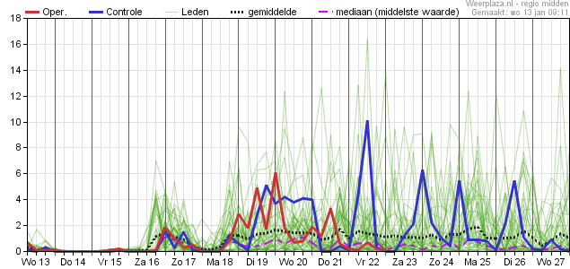 Vorst van de komende dagen is afgebouwd tot bijna niets. Verder zien we op LT nog twee clusters, een (zeer) zachte en een koudere die niet meer dan een 'normaal weertype' voor de tijd van het jaar oplevert. Oper en Control dansen er een beetje tussen. Ook behoorlijk nat. Wisselvallig dus en zeer maritiem na het weekend.