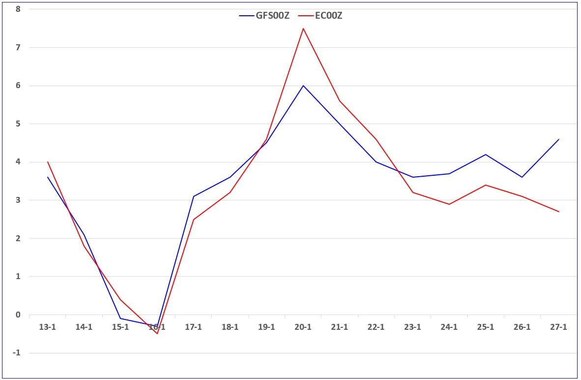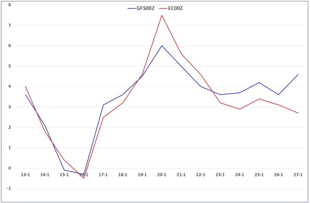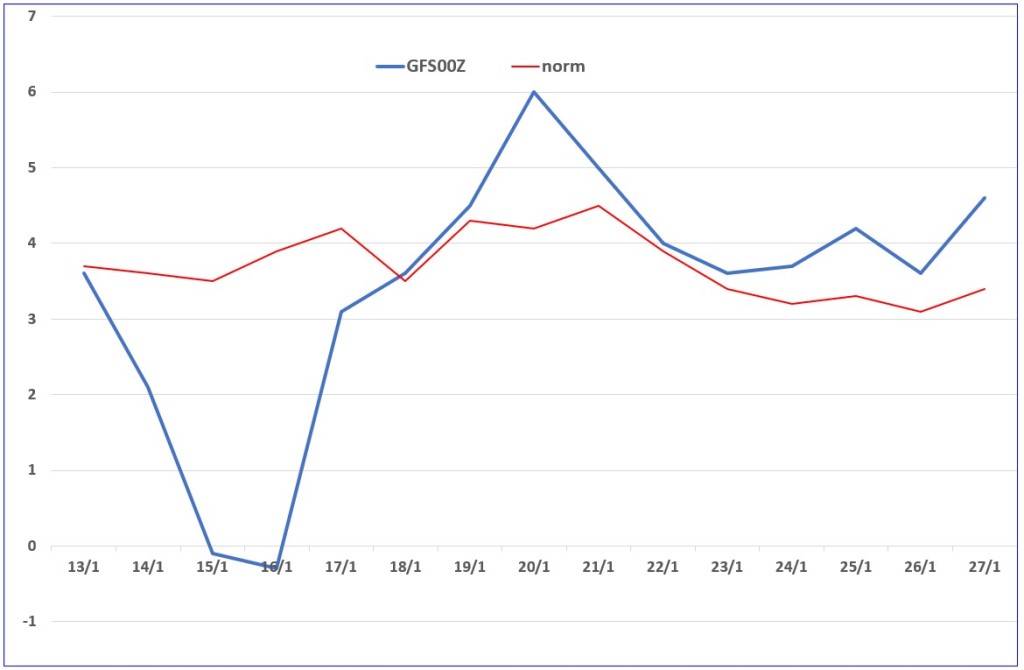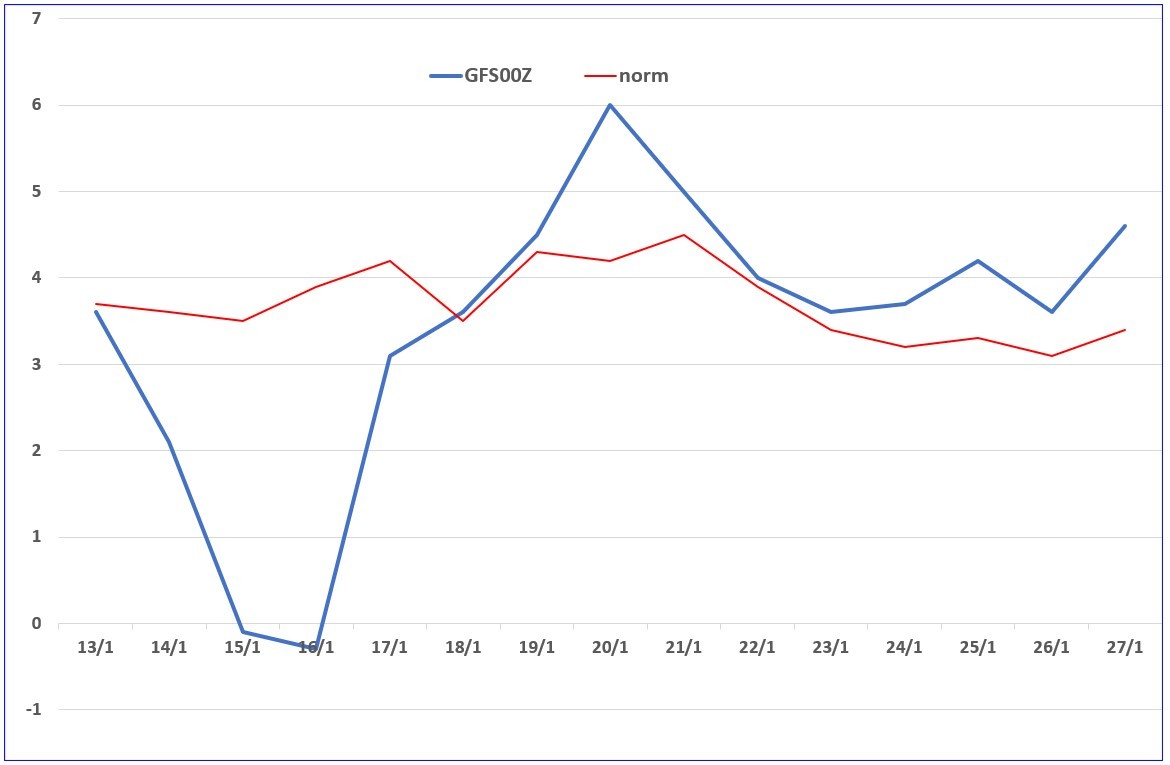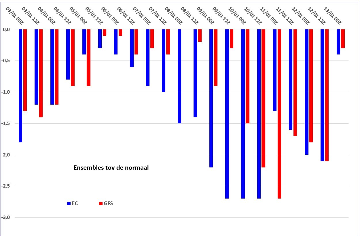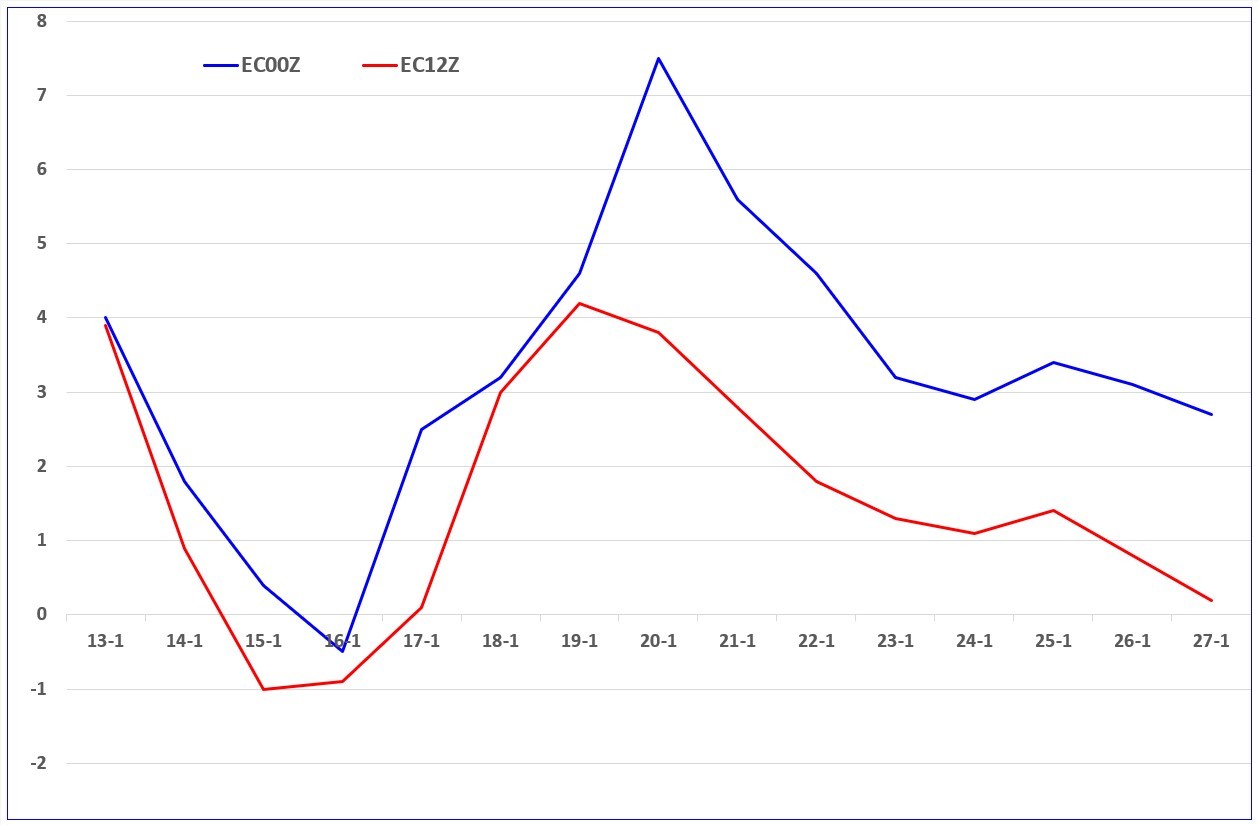 Trouwens ook conform de lange termijn verwachting van EC van 11 januari waarin meestal een normale temperatuur wordt verwacht voor de komende 4 weken.