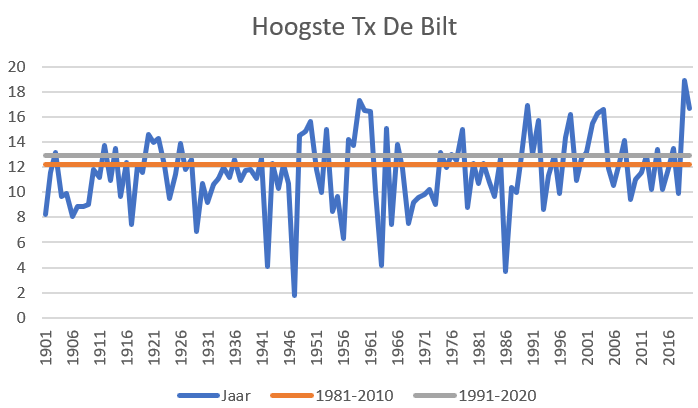 Een keer zal dat best gebeuren. Maar zelfs de 18.9C van 2019 was bizar hoog. Dáár nog eens 1.1C bovenop is gewoon niet waarschijnlijk in zo'n kort tijdsbestek. Het gat naar de nummer 2 is 1.6C.