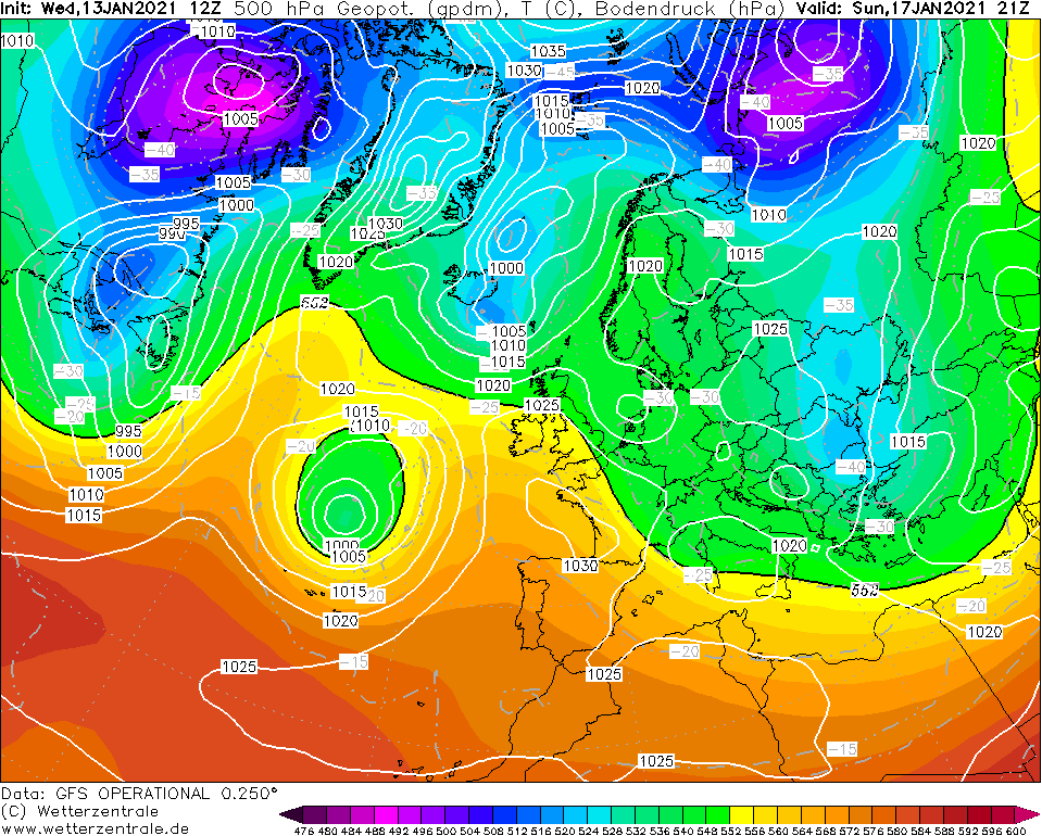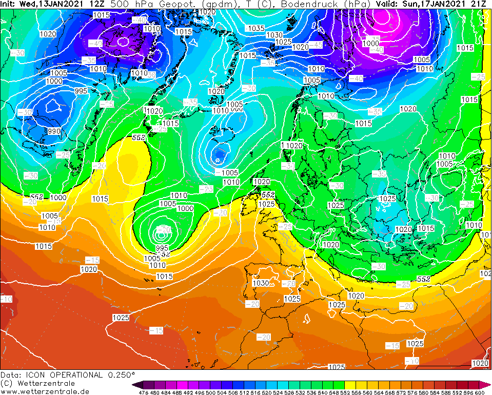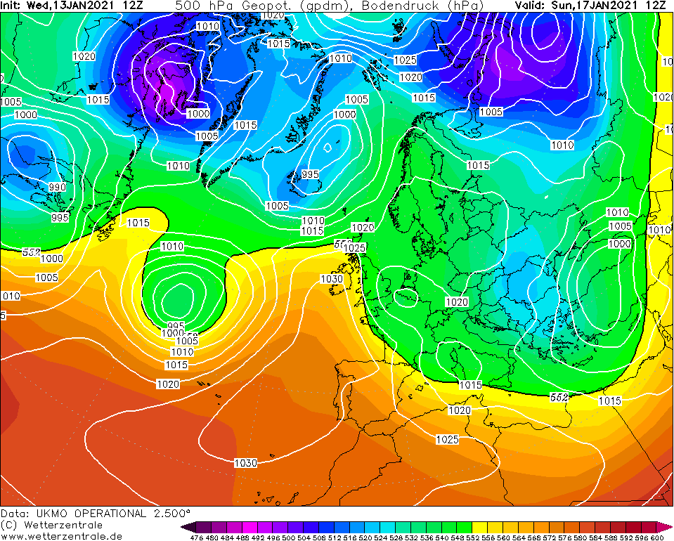 Erg onzekere situatie wat ook gevolgen heeft op de periode na zaterdag. Ukmo laat het laag afsplitsten wat er voor zorgt dat we op zondag nog een oostelijke stroming hebben. Icon laat het laagje niet splitsen waardoor er snel oceaanlucht achteraan komt. Gfs laat het laagje oneindig treuzelen boven het noordoosten van de benelux. Allemaal verschillende uitkomsten waarvan Ukmo de beste is voor een wat langer sneeuwdek.