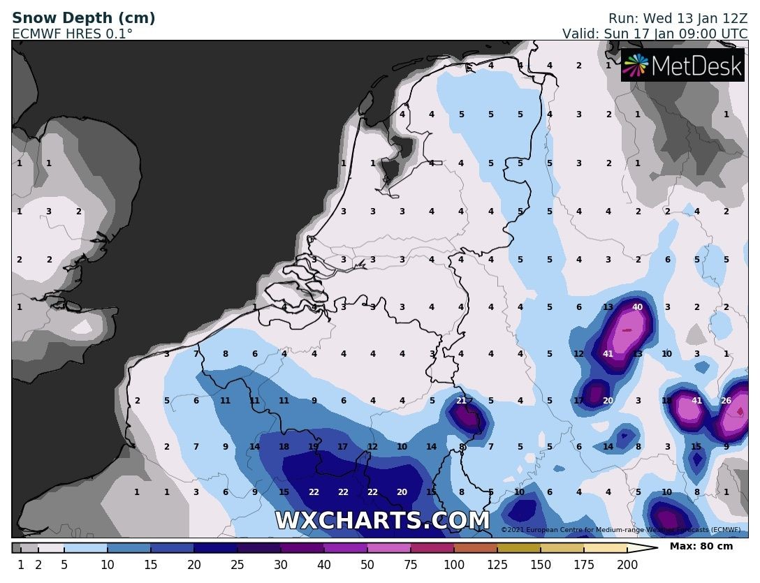 ECMWF toont opnieuw sneeuw zaterdagavond en zondagnacht.
