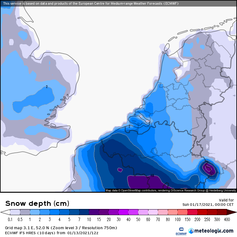 ECMWF toont opnieuw sneeuw zaterdagavond en zondagnacht.