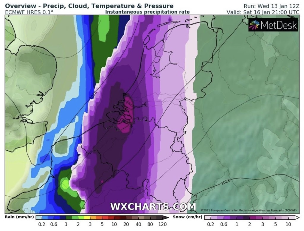 ECMWF toont opnieuw sneeuw zaterdagavond en zondagnacht.