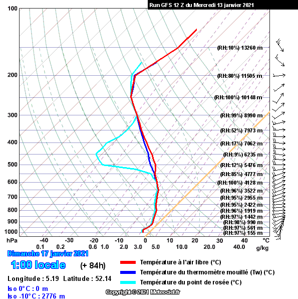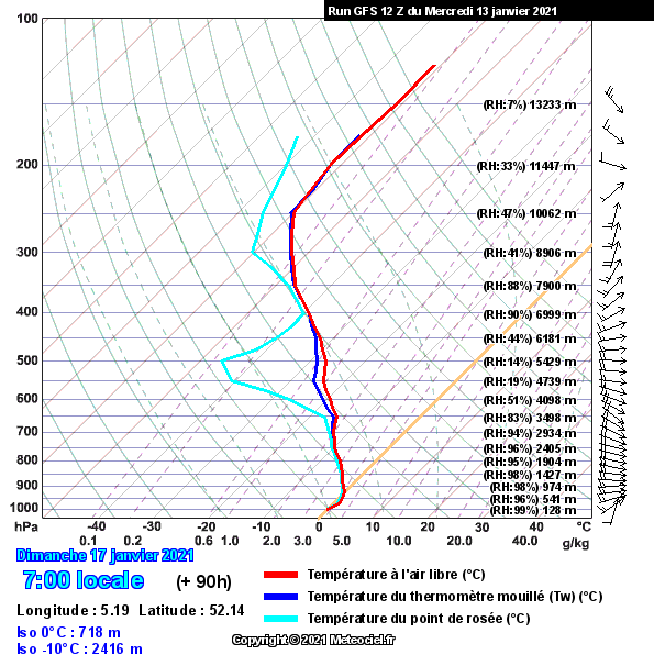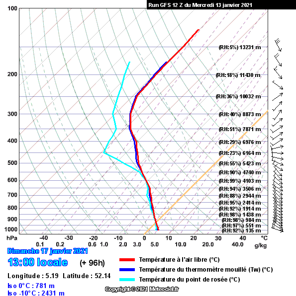 Wel even snel alleen naar De Bilt en mijn eigen omgeving gekeken. Voor De Bilt geven de verticale profielen een opeenvolging die wel past bij een 'dooiaaanval': eerst sneeuw, vervolgens een smeltlaagje op geringe hoogte (riskant voor ijzel) en dan gewoon regen. Helaas idd lage neerslaghoeveelheden in de uitvoer (de verzadigde laag gaat ook maar tot tot net geen 5 km, daarboven een drogere luchtlaag), dus idd weinig accumulatie.
