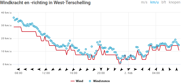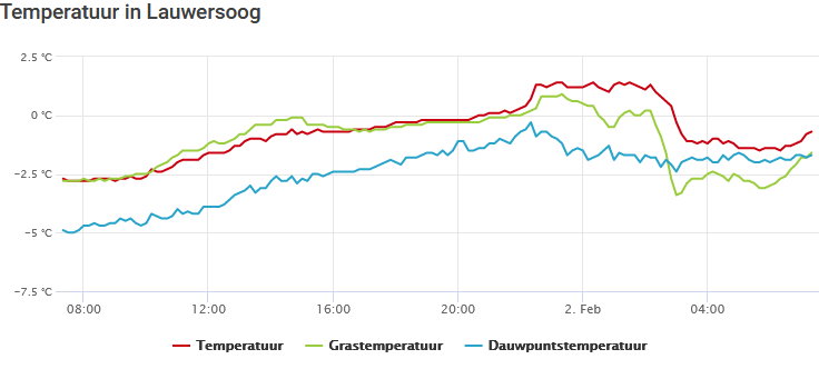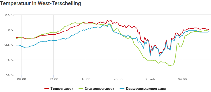 Vanochtend bleek de verdere ontwikkeling totaal omgekeerd te zijn: op Terschelling viel de wind weer weg en kelderde de temperatuur naar -4°C, terwijl er in Lauwersoog juist meer wind kwam, waarbij de temperatuur boven nul kwam. Op zo'n korte afstand dus een totaal verschillend verloop!