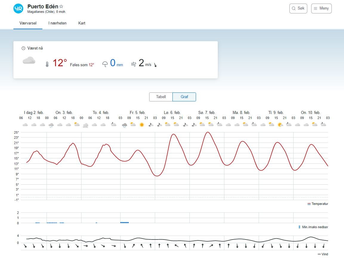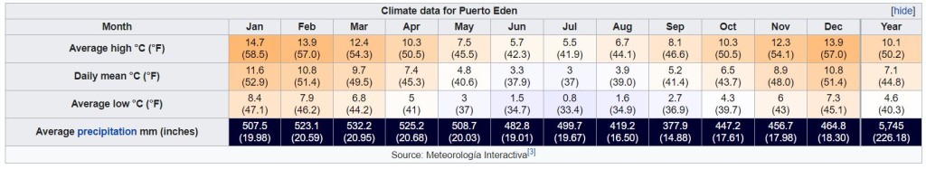 Wat Puerto Eden op meteorologisch vlak interessant maakt is het extreem natte oceaanklimaat, dat nog wordt versterkt doordat de westerlies zich hier frontaal in de zuidelijke Andes boren met heel veel orografische neerslag als gevolg. Er valt zo'n 6000mm neerslag per jaar, min of meer gelijk gespreid over de maanden. Dat impliceert dat er nauwelijks een droge dag is: het wereldrecord 'natste jaar' is gevestigd door een weerstation iets verder naar het zuiden, met slechts 18 droge dagen over het hele kalenderjaar 1916. Dat alles natuurlijk met een flinke portie wind.