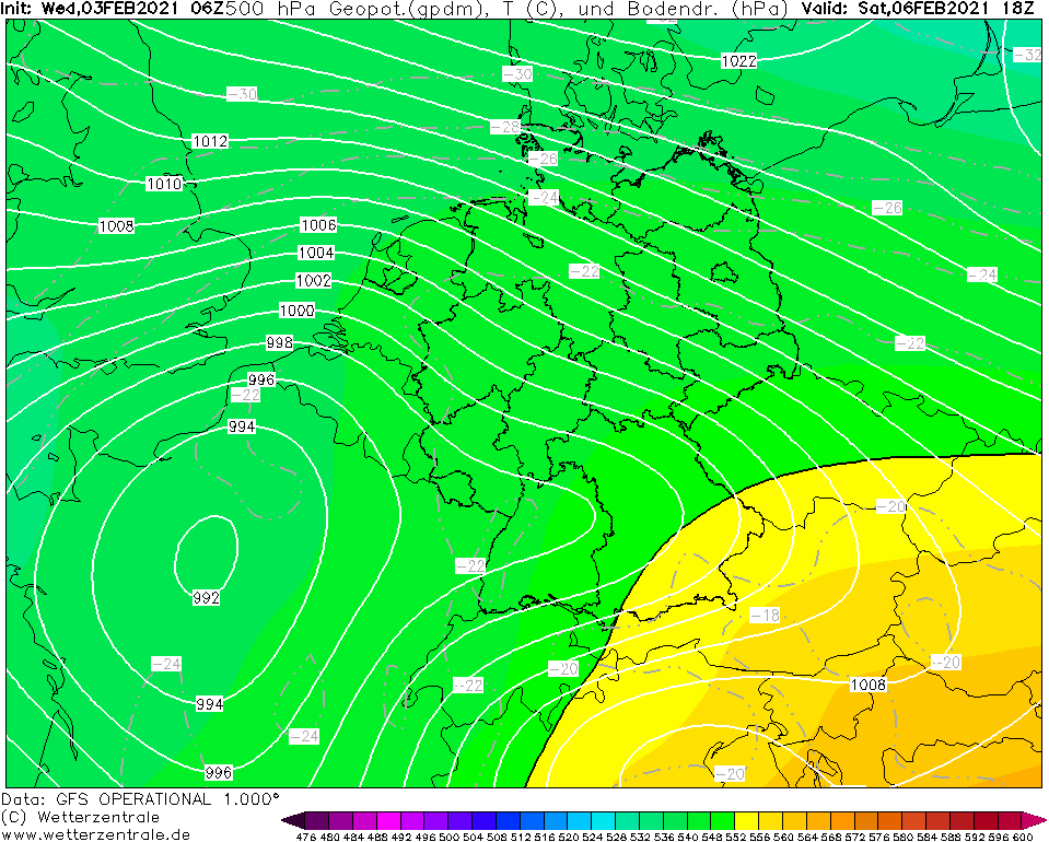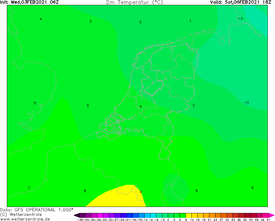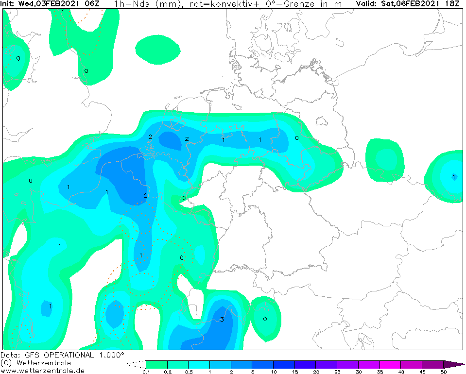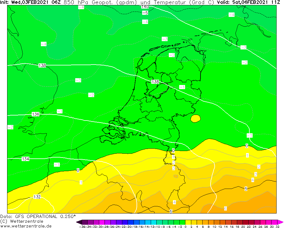 Op zaterdagavond valt de vorst binnen in het NO. Laagje lijkt zuidelijker door te trekken. In Vlaanderen en Z-Nederland dan nog lauwe regen. Stilaan sneeuw ten noorden van Amsterdam.
