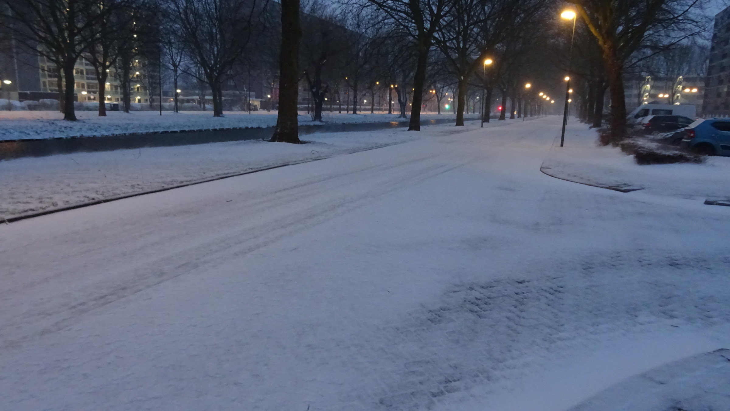 De straat die je ziet, is prima te belopen/berijden. Het is een dun laagje bevroren sneeuw, heel ribbelig. Op het gras bij de vijver 2 á 3 cm sneeuw.