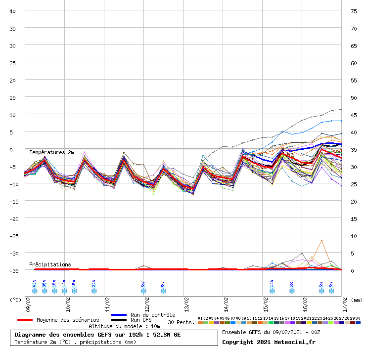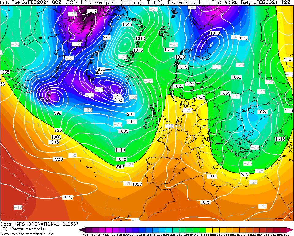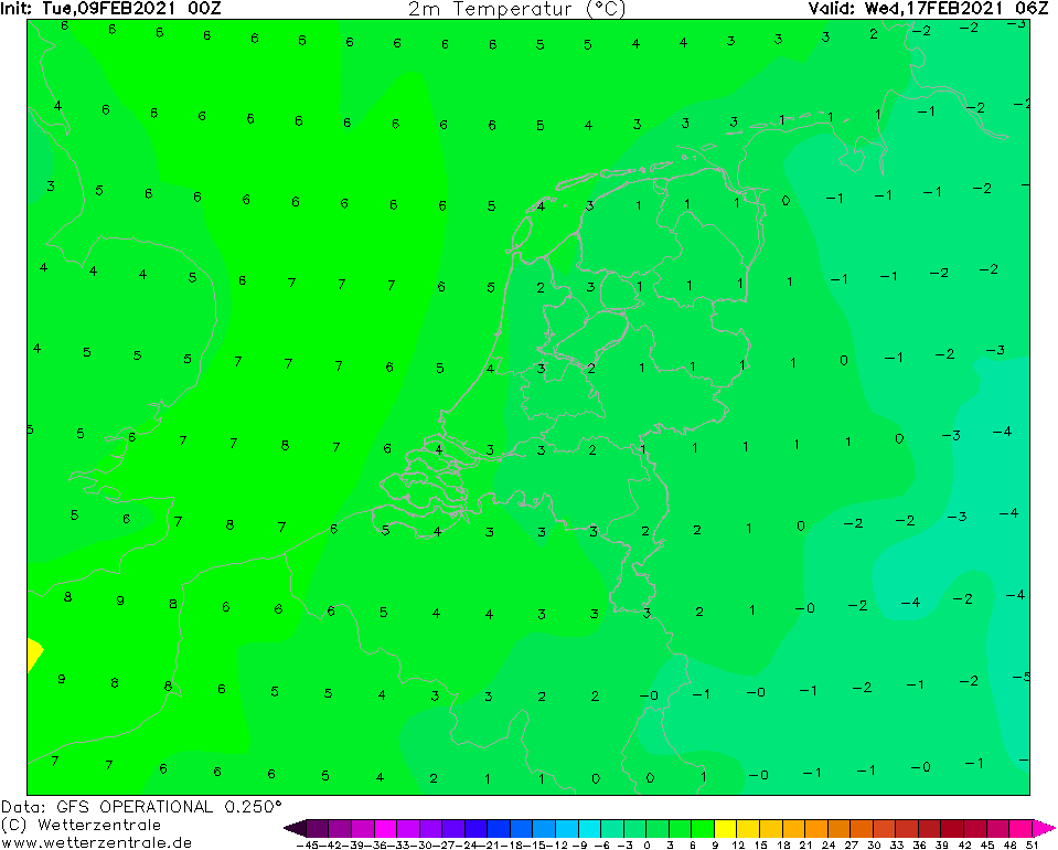Of het Scandinavische hogedrukgebied er komt is nog maar zeer de vraag. De kaarten "verslechteren" als het daar om gaat. Ingezoomd, en dan kijk ik alleen naar Nederland, lijkt het tot volgende week koud te blijven. Dan verovert de zachte lucht ons land op dinsdag langzaam en komt het in de nacht naar woensdag nauwelijks meer tot vorst. Daarna komt deze ook niet meer terug. De oper zit bovenin het ensemble zo te zien. De tendens van een geslaagde dooiaanval volgende week lijkt wel te blijven.