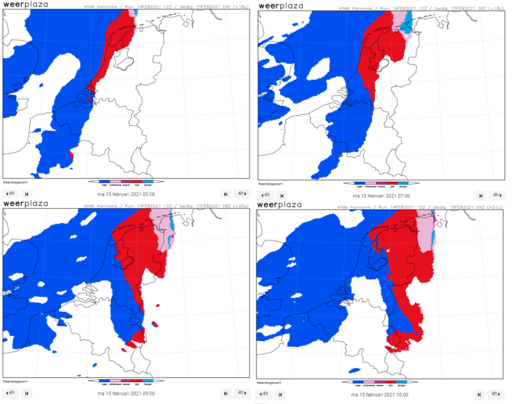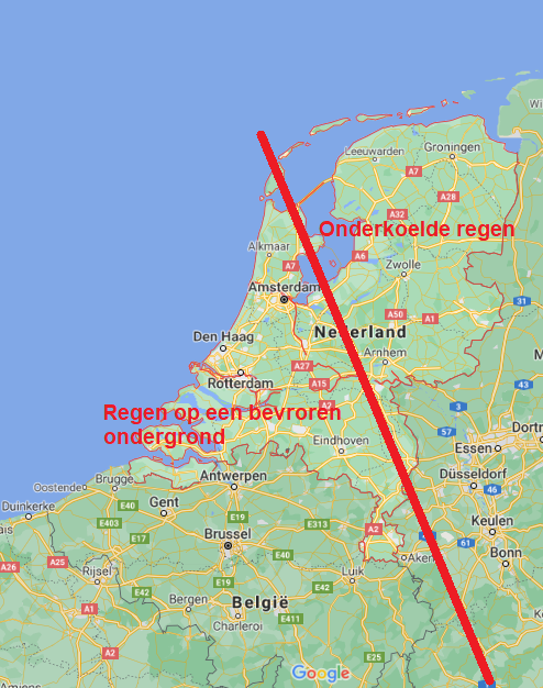 Ten zuidwesten daarvan gewone regen op wellicht een bevroren ondergrond, deze zal dan ook direct bevriezen.