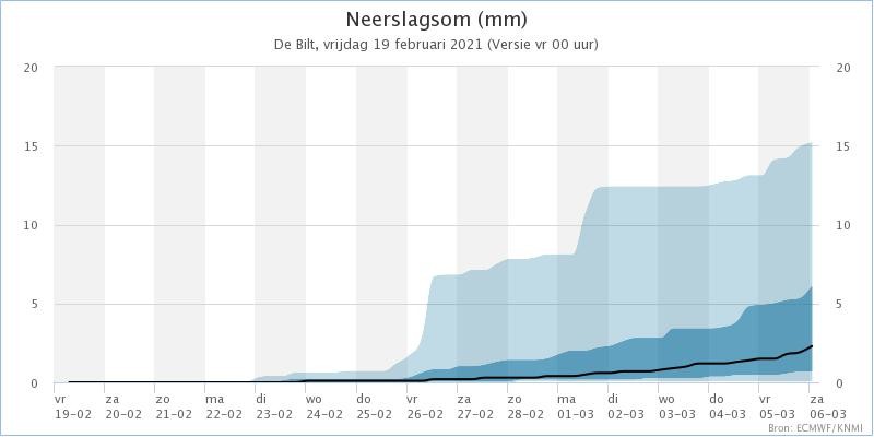 Vrijwel nooit zo'n droge pluim gezien met de mediaan voor de neerslagsom op 15 dagen vooruit op 2,3 mm (!). In bijvoorbeeld de zomer van 2018 kwam de mediaan helemaal op het einde vaak nog uit op zo'n 5 mm, idem voor de lente van 2020. Zeer bijzonder.
