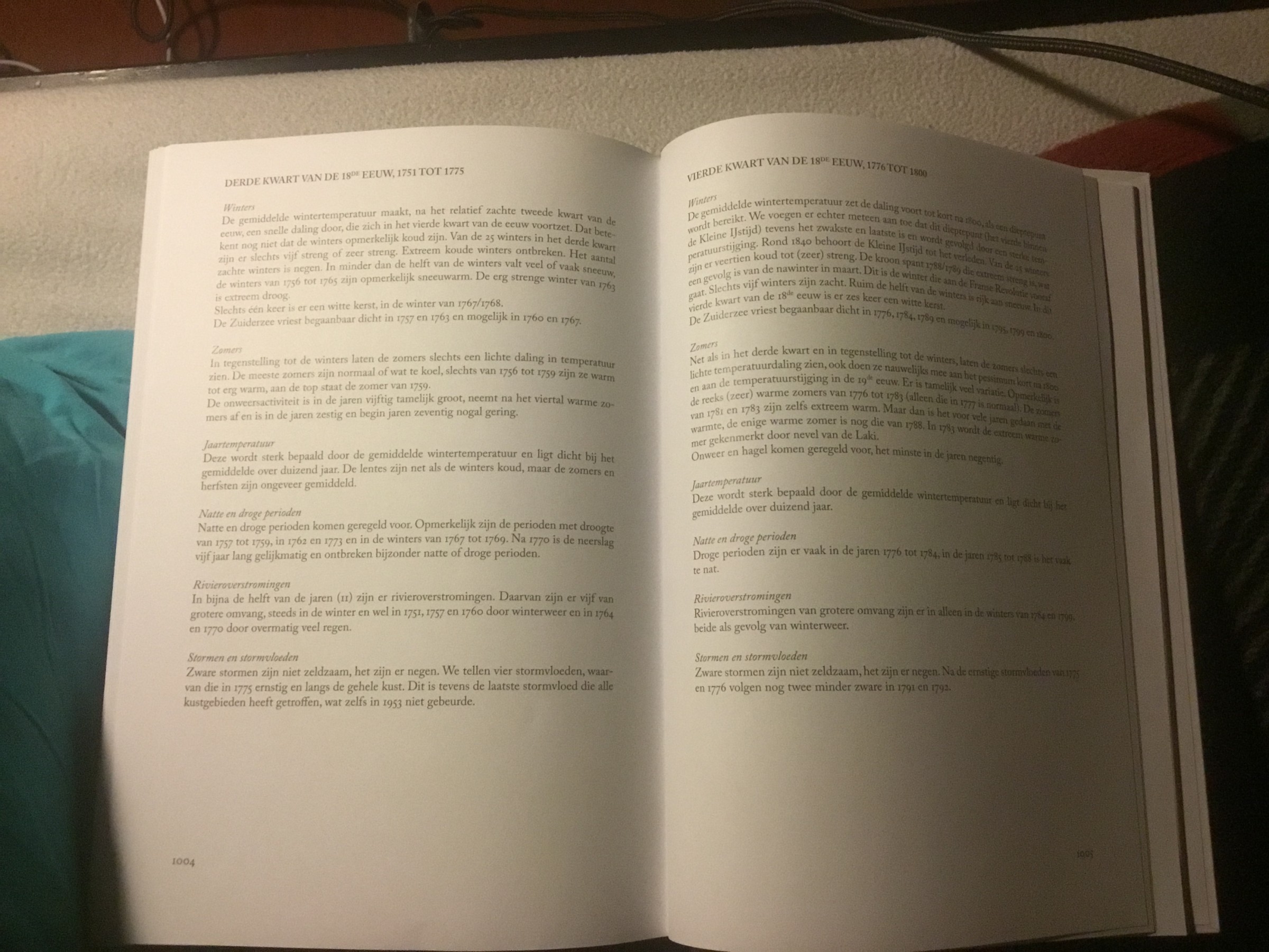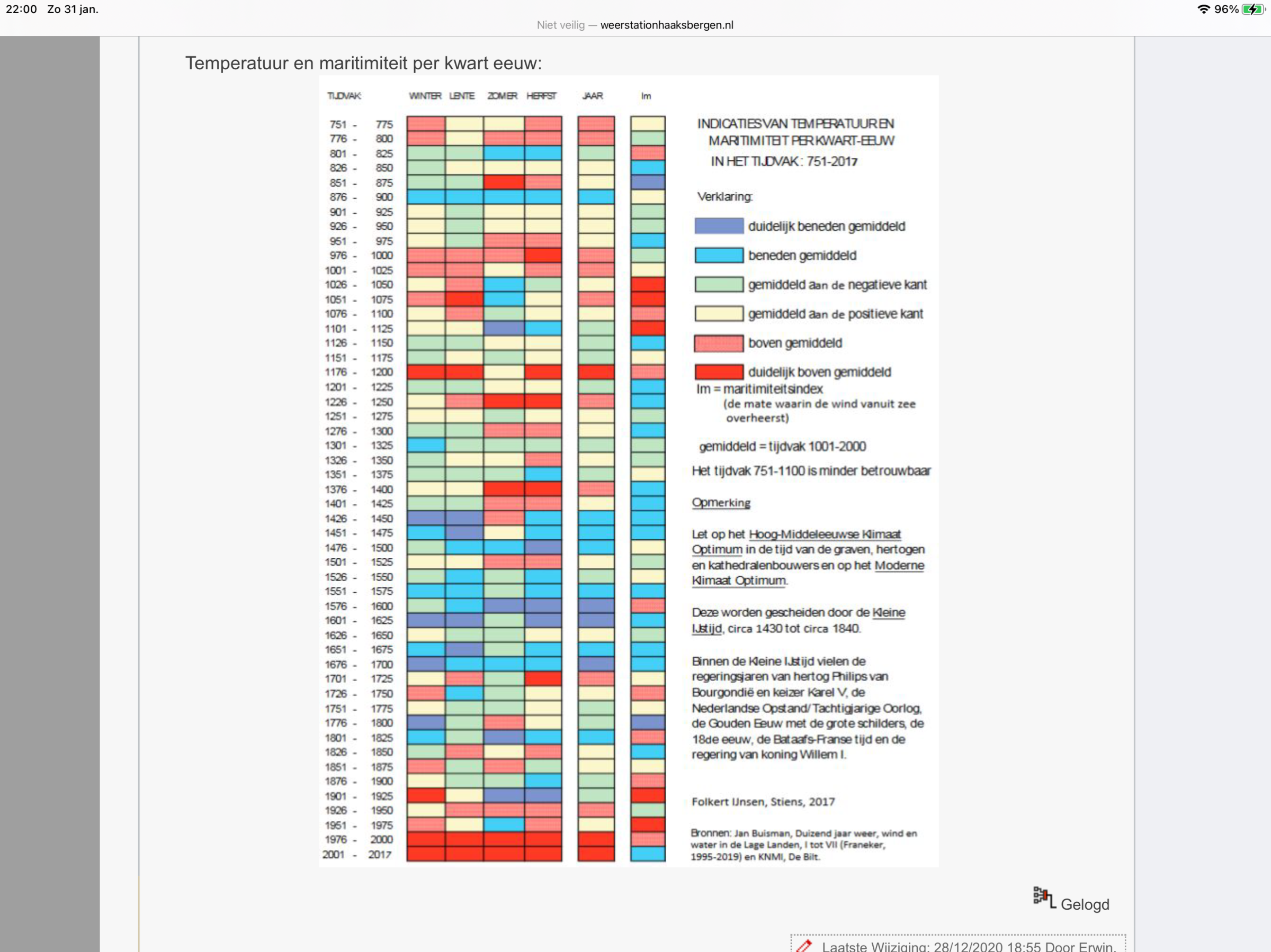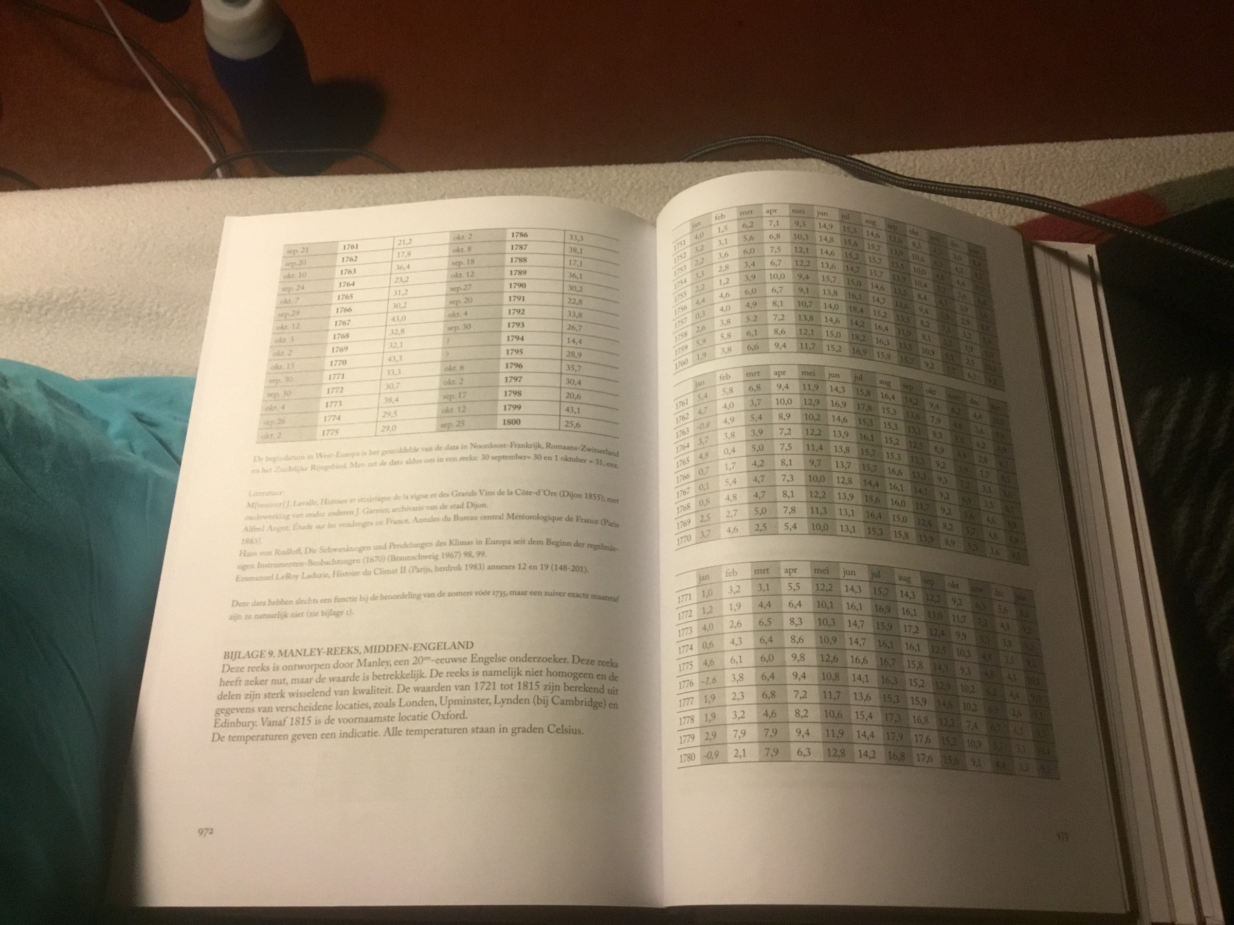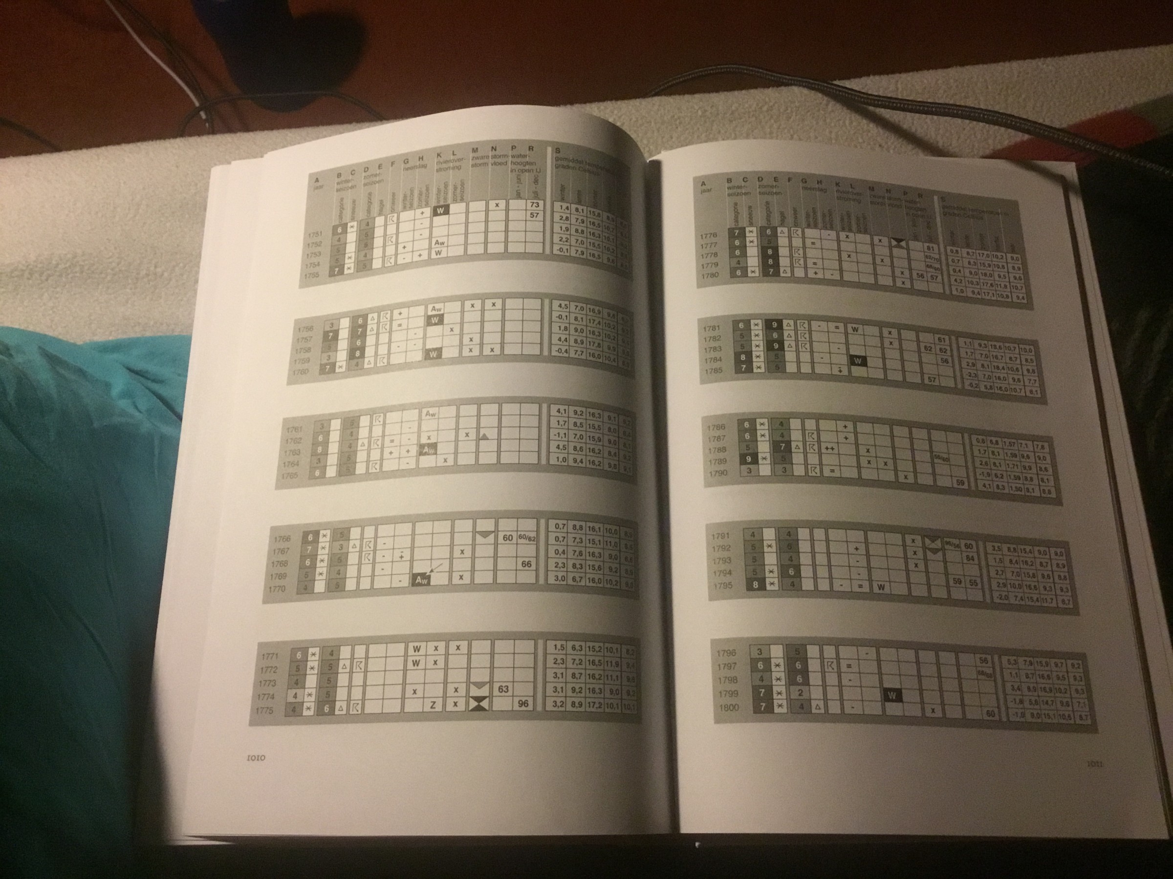 4e foto: Legenda met vele gegevens, van de gem. temp. van de 4 seizoenen in de jaren 1751-1800 bijv. Ook de jaartemperatuur en neerslag, stormvloed etc. vind men terug.