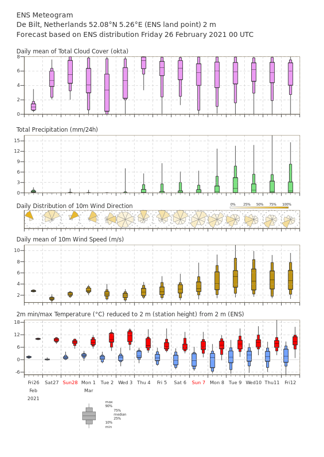 Op de langere termijn hint het overgrote deel van de leden op een toenemende wind vanuit het (zuid)westen, in combinatie met veel bewolking, regelmatig neerslag en temperaturen rond normaal. Mogelijk daar vooruit nog enkele dagen een noordelijke windcomponent met vrij lage temperaturen, maar vanaf 8 maart laat zo'n 75% van de leden een wind uit het westen of zuidwesten zien. Maar voordat het zo ver is, eerst nog een aantal vrij zonnige en droge dagen.