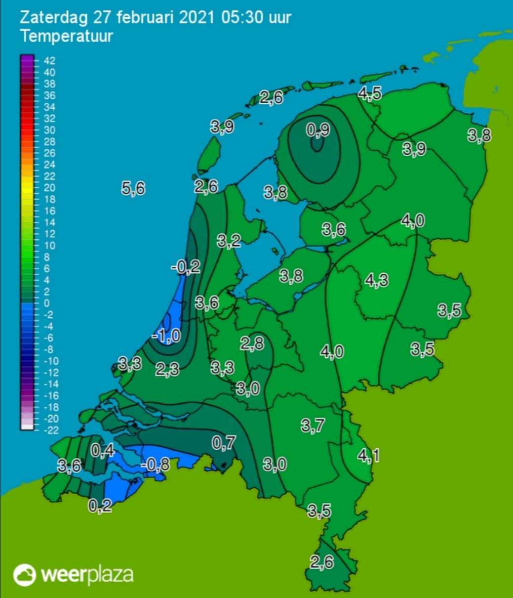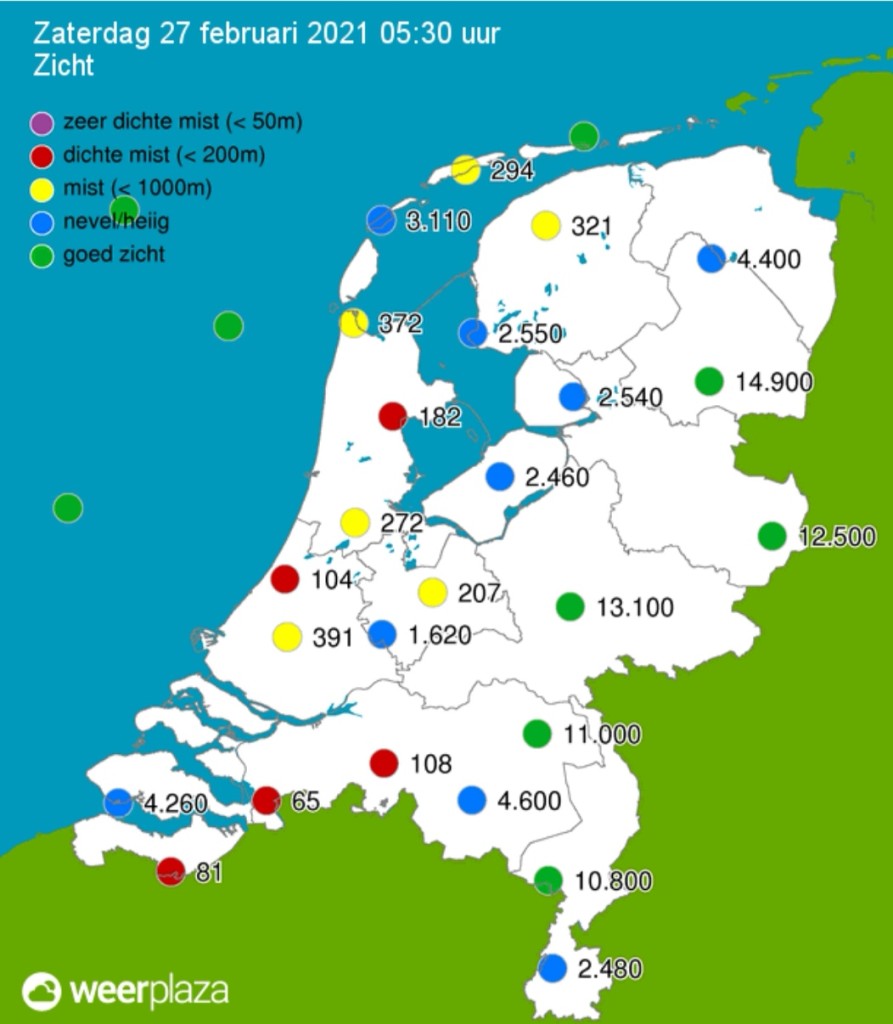 Aan de kust en het zuidwesten lichte vorst, verder vooral in het westen en zuiden dichte tot zeer dichte mist momenteel.