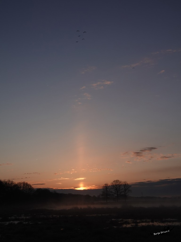 "Een zonnezuil is een optisch verschijnsel dat onder de halo's valt. Een zonnezuil kan ontstaan als er zeshoekige ijskristalletjes horizontaal in de lucht zweven en het licht van de zon weerkaatsen. Het weerkaatste licht wordt dan ook weer gereflecteerd door andere horizontale ijsdeeltjes waardoor het effect versterkt wordt. Zo werken de ijskristallen als spiegeltjes."