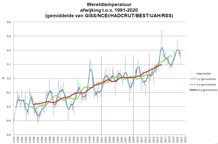 Ikheb in de grafiek een paar lijntjes getrokken. De eerste in 2001. De volgende in 2009 en daarna in 2013. Redelijk willekeurig, maar om de jaren iets beter te kunnen zien. Tussen 2002 en 2009 hebben we een quasi-flatline, daarna stijgt de temperatuur gestaag door in hetzelfde tempo.