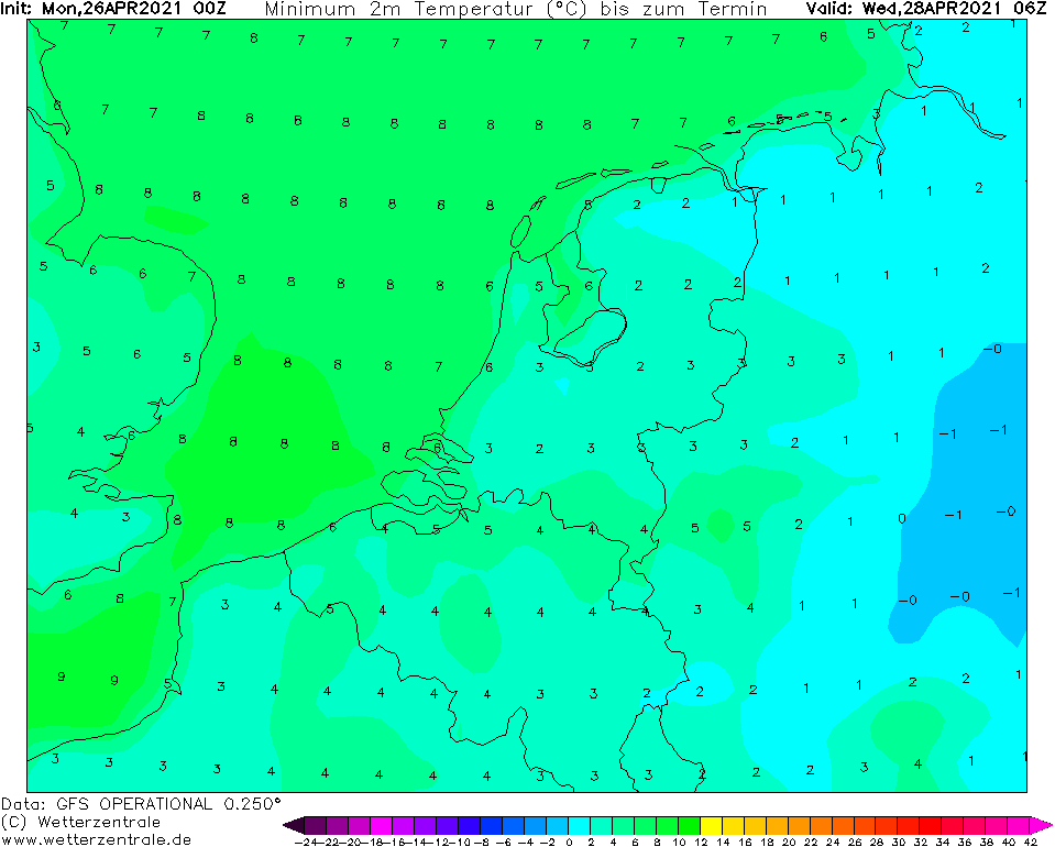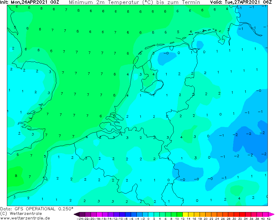 In de ochtend plaatselijk nog lichte vorst. Ook morgennacht nog koud. Droog