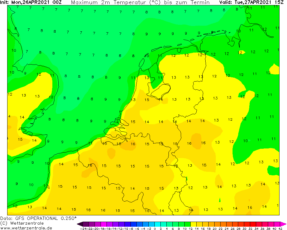 GFS oper 00Z. Koningsdag tussen 12 en 15 °C.