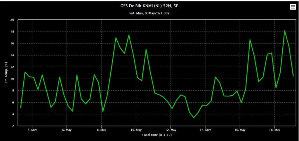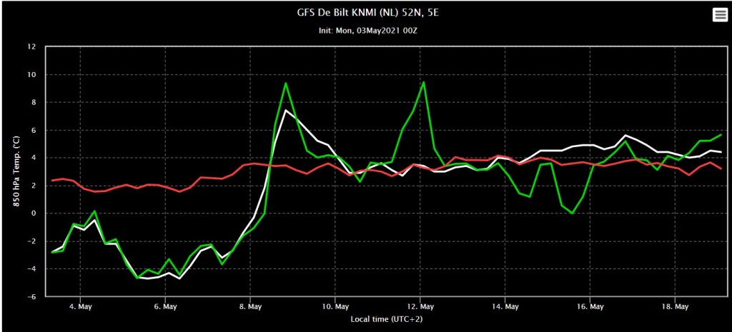 Kijk je naar de 850 hPa verwachting dan zit de oper geregeld op de normaal in de periode vanaf 9 mei pakweg.