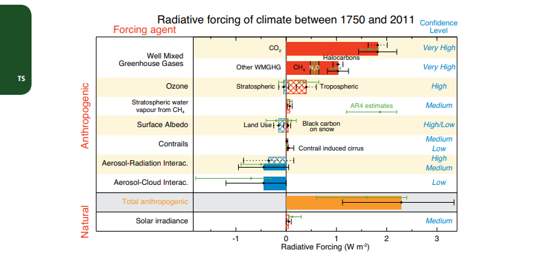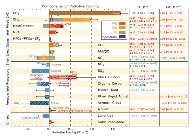 ''Persistent contrails from aviation contribute a positive RF of 0.01 [0.005 to 0.03] W m–2 (medium confidence) for year 2011, and the combined contrail and contrail-cirrus ERF from aviation is assessed to be 0.05 [0.02 to 0.15] W m–2 (low confidence). This forcing can be much larger regionally but there is now medium confidence that it does not produce observable regional effects on either the mean or diurnal range of surface temperature.'' (p.574)