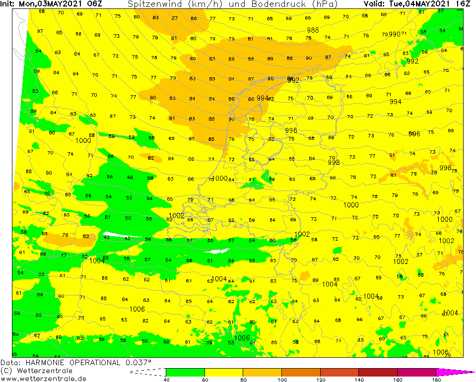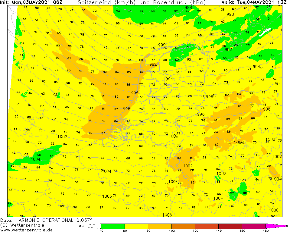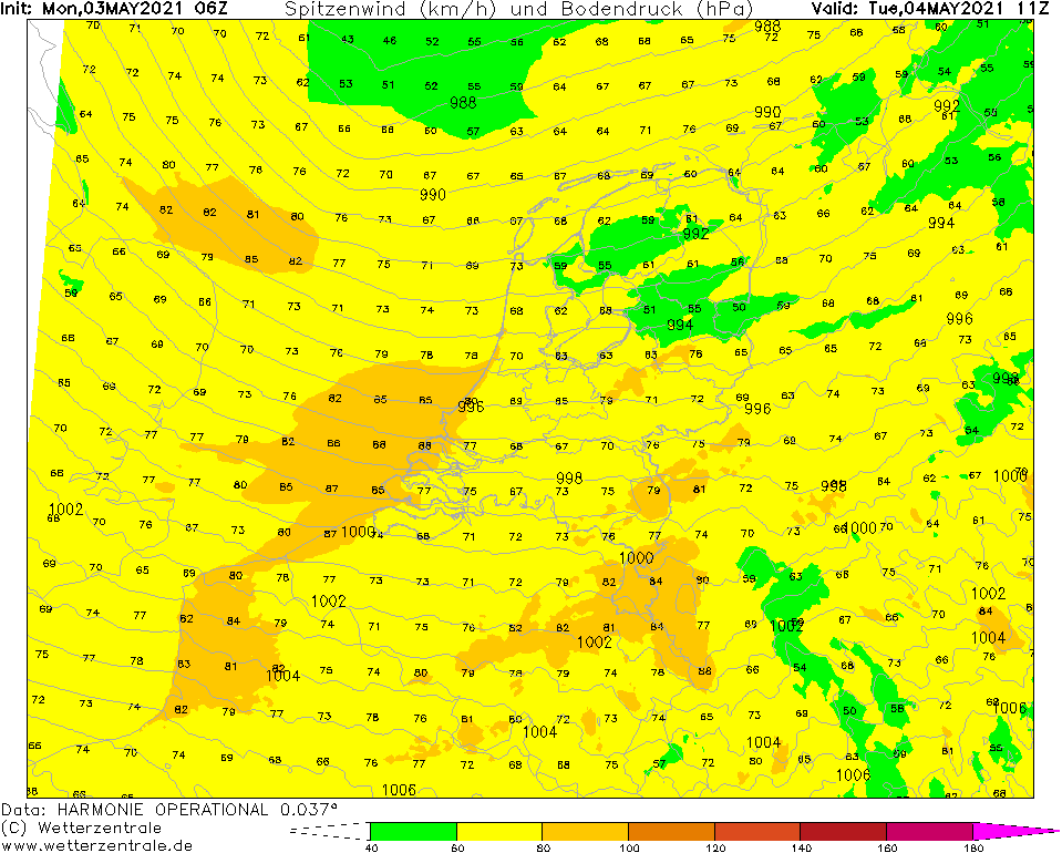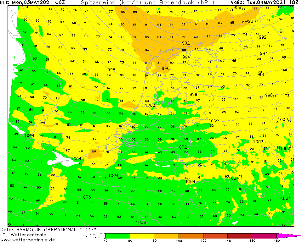 Vanaf halverwege de avond op de zuidelijke Noordzee seinen voor ZZW 7-8 Bft op nadering van het laag. Soms tipt de wind aan de westrand van de FIR net even aan de 9 Bft, deze lijken onze kustdistricten echter niet te bereiken. Morgen overdag seinen voor 7-8 Bft in onze kustdistricten, boven land vooral tijdens buien bij de trog en de occlusie windstoten tot ca. 80 km/u, in het noordwestelijk kustgebied en in de Limburgse heuvels mogelijk tot 90 km/u. Later in de middag en avond neemt de wind met het wegtrekken van het laag van het zuidwesten uit geleidelijk af. De zware windstoten verdwijnen als laatste in het noorden van het land halverwege morgenavond. De seinen voor 6-7 Bft houden in het noordelijk kustgebied echter tot en met de nacht naar woensdag aan.