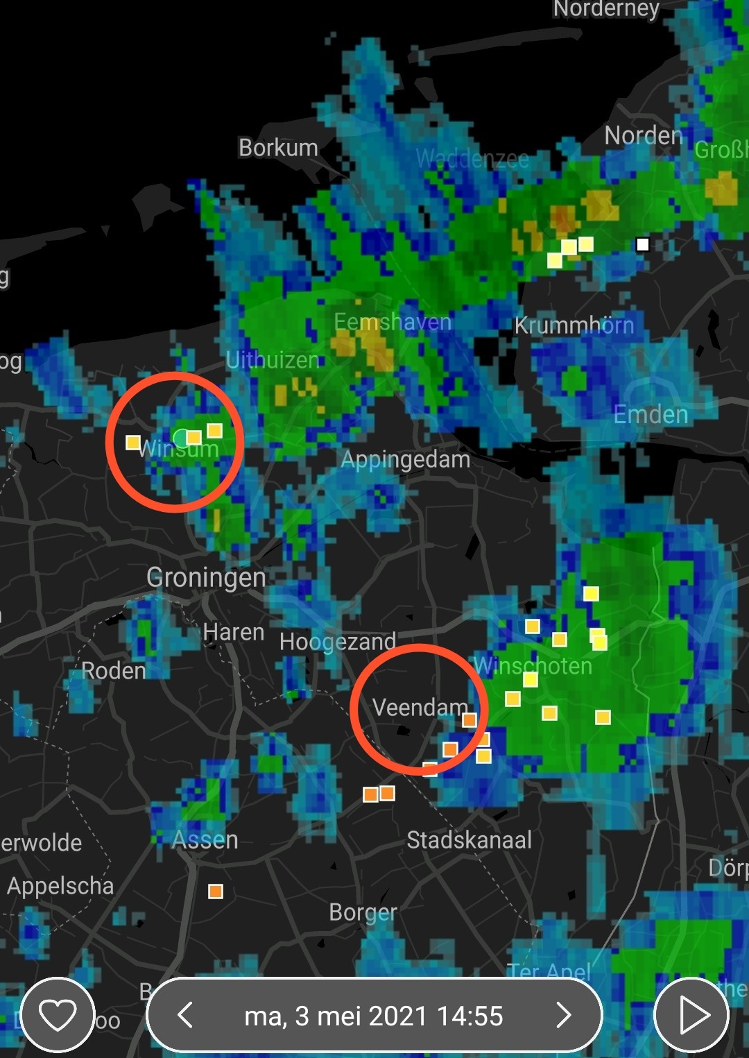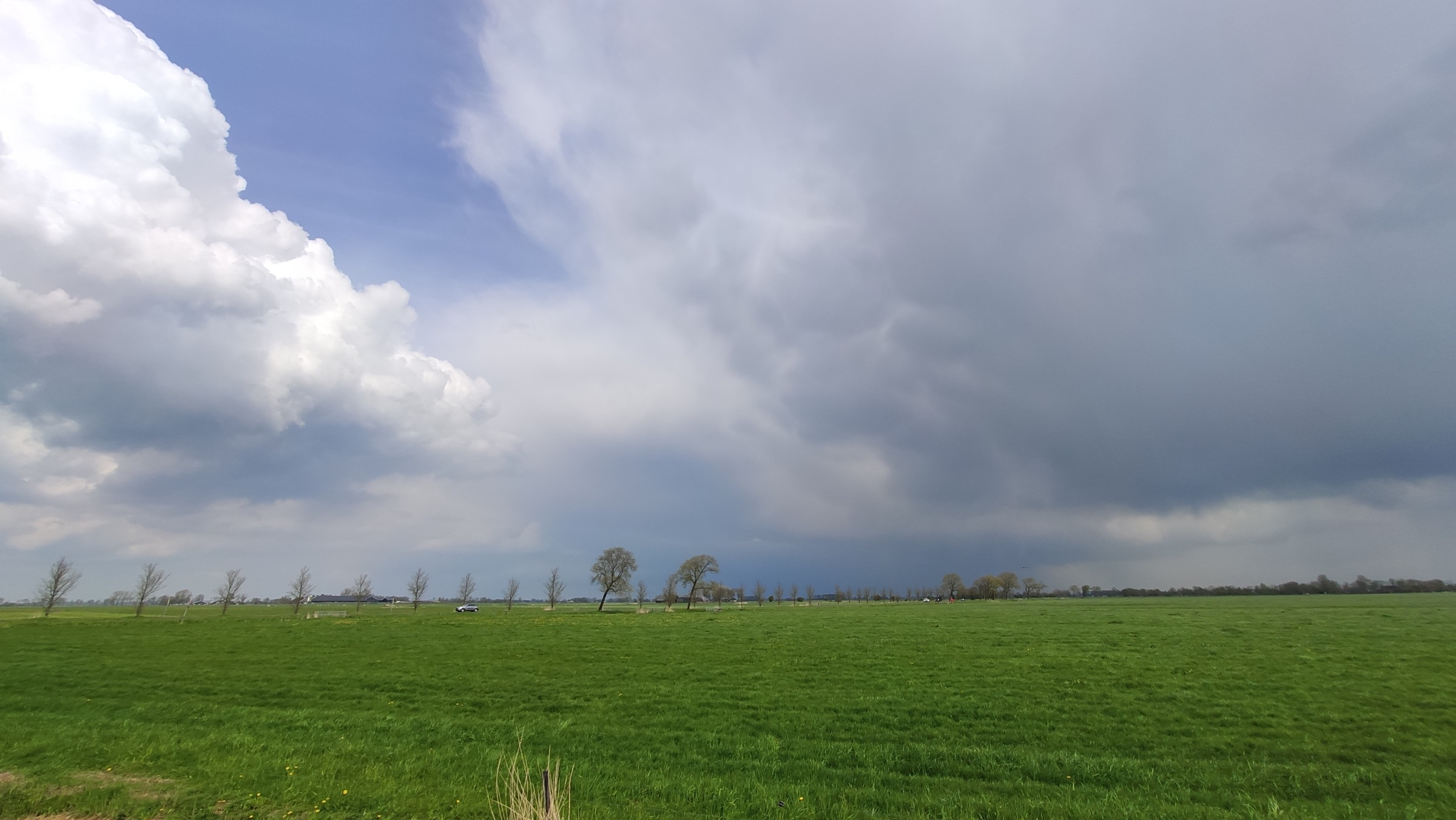 2 keer op afstand. Nu enkele forse dreunen tijdens een stevige regen- en hagelbui. We zitten goed, Erik.
