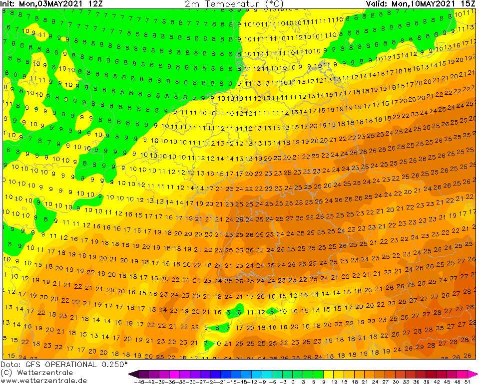 Gfs12 oper zondag de warmste dag 17/18gr en maandag koel.