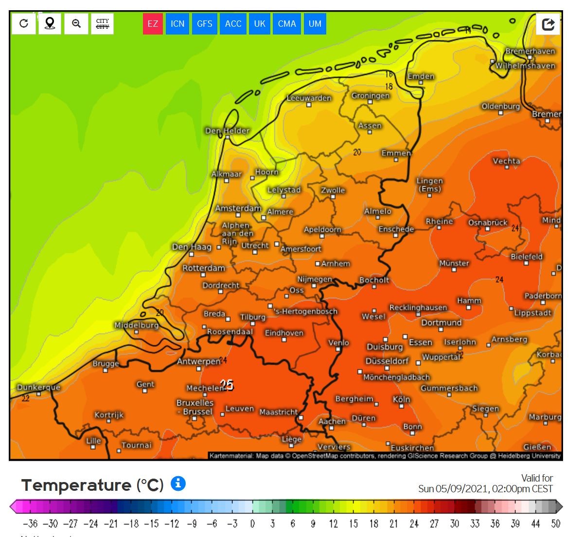 Maandag aanvankelijk nog warm, maar vanuit het westen afkoeling