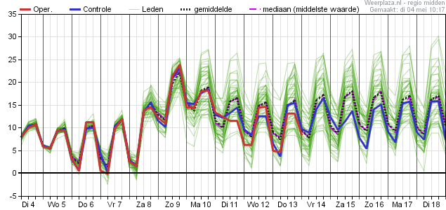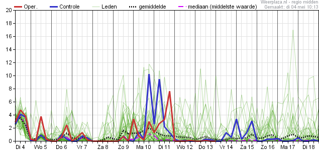 Er lijkt een oplossing te komen tussen de runs van ECMWF en GFS in van enkele dagen terug; we komen wel in de warme lucht terecht, zij het alleen tijdelijk. Zondag lijkt nu eigenlijk de enige echt warme dag te worden met in het binnenland mogelijk zomerse waarden. Verder zien we op zondag, maandag en dinsdag hoge neerslagkansen, mogelijk zit daar ook onweer bij.