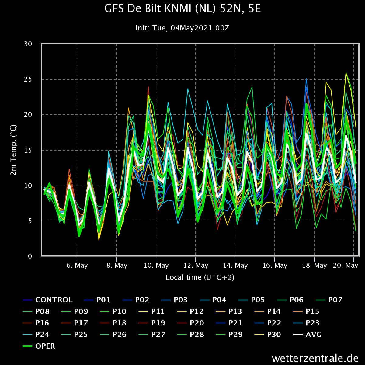 Dagenlang bleef GFS komen met gemiddeld slechts zo'n 15 graden op zondag, ook al kwam EC al een tijdje met temperaturen rond de 18 - 24 graden. GFS maakt in het 00z ensemble nu ook eindelijk de sprong omhoog en komt gemiddeld op zondag nu met zo'n 18 - 19 graden. Aan de andere kant had GFS (als het uitkomt) eerder in de smiezen dat de warmtepiek iets korter zou aanhouden dan EC. Dus allebei de modellen doen een beetje water bij de wijn.