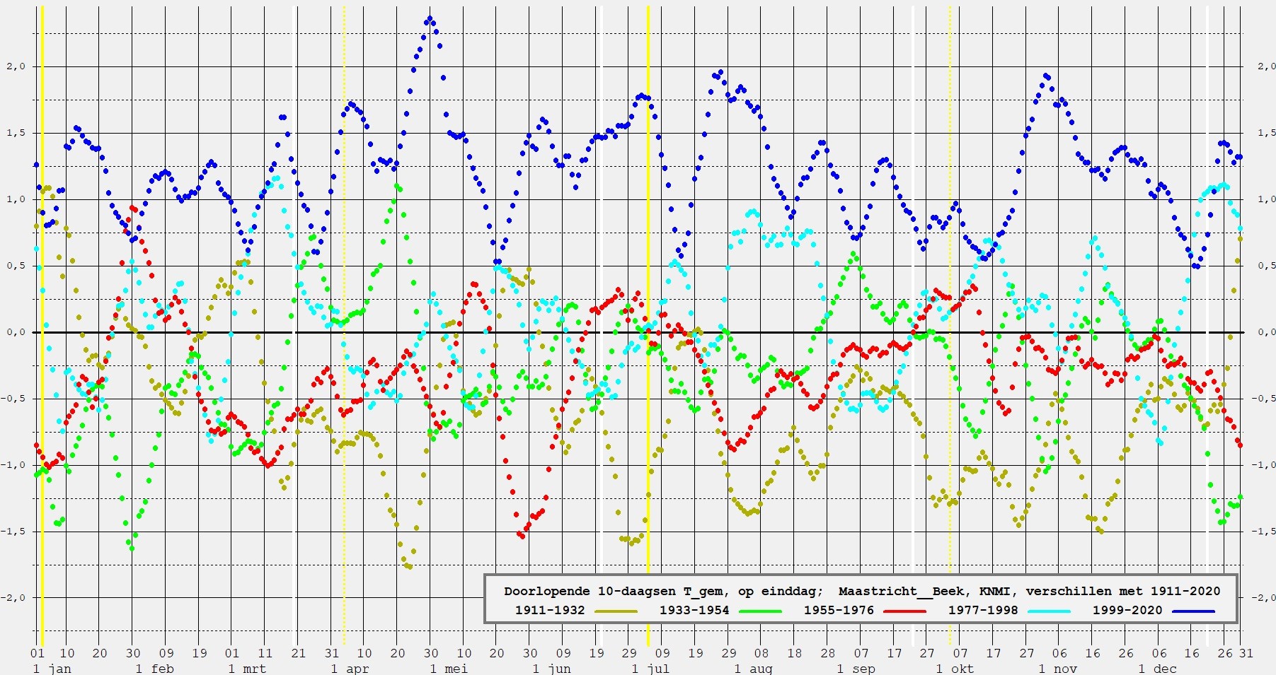 De 2 perioden ( 1933-1954 en 1955-1976 ), met vrijwel gelijke gemiddelden, laten toch grote verschillen zien in de gang door de 365 dagen.