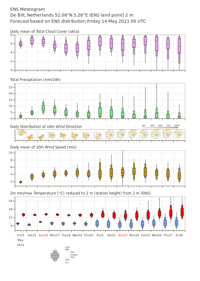 Dat gezegd hebbende zijn de neerslagkansen vanaf morgen t/m volgende week zaterdag dagelijks zeer hoog (>80%) en zou er vooral op zondag en maandag echt wel een flinke som kunnen vallen. De temperaturen komen dagelijks uit rond of iets onder de 15 graden (al is er wellicht wel wat onderschatting door ECMWF). Pas richting de laatste dagen van de maand (26 - 28 mei) zien we de mediaan stijgen naar waardes iets boven de 15 graden, maar ook dat is natuurlijk nog duidelijk onder normaal (20°C). De oorzaak? Vrijwel uitsluitend leden met een noordelijke windcomponent in de verwachting.