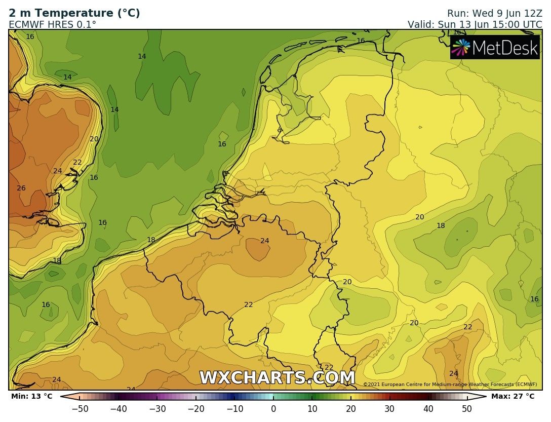 ECMWF 96 uur, verkoeling in het weekend (nog) van korte duur