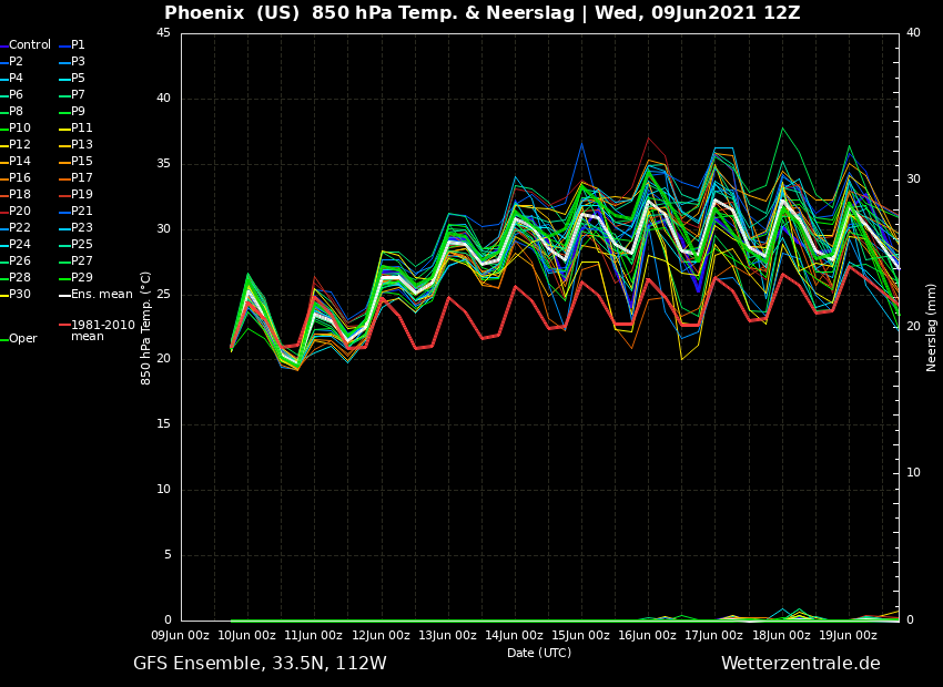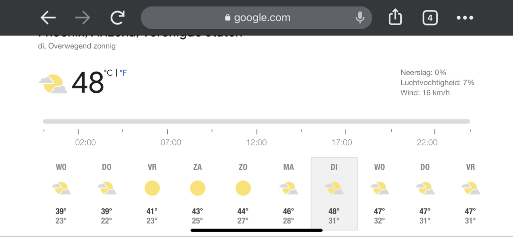 De komende weken gaat Phoenix, Arizona concurreren met de heetste steden ter wereld zoals Basra. De laatste week was het er nog relatief ‘normaal’ maar daar komt snel verbetering in. Maxima tot maar liefst 48 graden. De lage RV zal de hitte wellicht wat draaglijker maken maar sodeju wat een hoge maxima voor een westerse miljoenenstad!