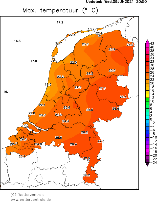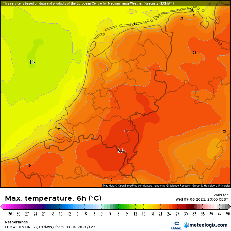 ECMWF heeft zo'n grove resolutie dat er eigenlijk geen gridpunten aanwezig zijn op de Waddeneilanden. Vandaag werd het op Terschelling 22,5 graden, terwijl ECMWF voor maximaal 16 à 17 graden ging. Hetzelfde geldt voor de regio's die pal aan zee liggen. Lauwersoog vandaag 22,9 graden terwijl ECMWF slechts 19 graden toonde. Zelfde geldt voor Hoek van Holland.