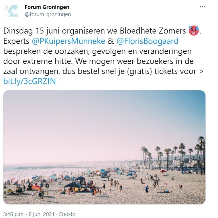 Forum Groningen op Twitter: "Dinsdag 15 juni organiseren we Bloedhete Zomers ????. Experts @PKuipersMunneke & @FlorisBoogaard bespreken de oorzaken, gevolgen en veranderingen door extreme hitte. We mogen weer bezoekers in de zaal ontvangen, dus bestel snel je (gratis) tickets voor > https://t.co/kEHIQVXiTR https://t.co/n1snlqoUZ6" / Twitter