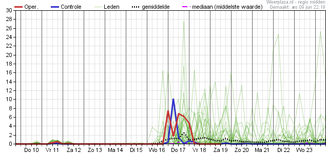 In het weekend iets frisser en voornamelijk op zaterdag ook veel bewolking, maar daarna breekt een periode met puur zomerweer aan, waarschijnlijk tot en met woensdag. In die periode kan het op dinsdag en woensdag misschien wel tropisch warm worden, niet alleen lokaal maar (vooral op woensdag) mogelijk ook in De Bilt. Zou dat 28.3 graden record van 15 juni dan toch nog verbroken kunnen worden? Daarna botst de koude op de warme lucht en vindt een overgang naar normaler juniweer plaats met temperaturen van zo'n 20 - 22 graden, ook al laat de oper zien dat frissere scenario's van zo'n 15 - 17 graden ook nog mogelijk zijn. Die overgangsperiode kan op woensdag en donderdag volgende week mogelijk voor veel onweer zorgen, maar het is nog een beetje te ver weg om daar iets zinnigs over te zeggen. Uiteindelijk lijken dus zowel GFS als EC gelijk te krijgen: GFS omdat het de overgang naar minder warm juniweer eind volgende week eerder in de smiezen had en EC omdat het tot die overgang toch nog een stuk warmer lijkt te worden dan GFS eerder deze week aangaf.