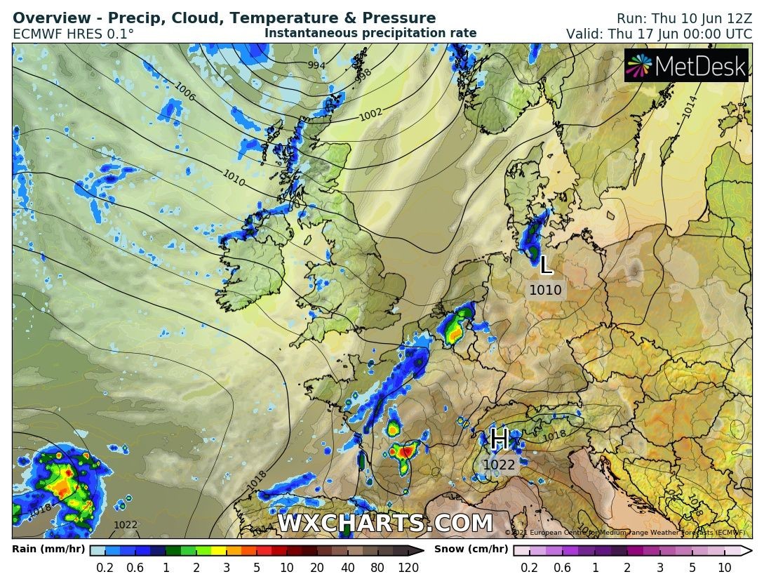 Alleen het zuid-oosten maakt nog een kans op wat buien in deze oper. Depressie zakt niet ver genoeg uit naar het zuiden, hoogtetrog ook ver nw waarts: