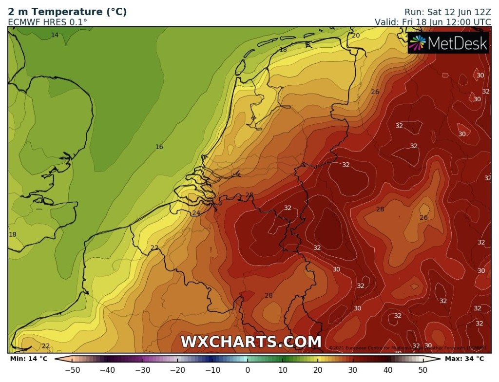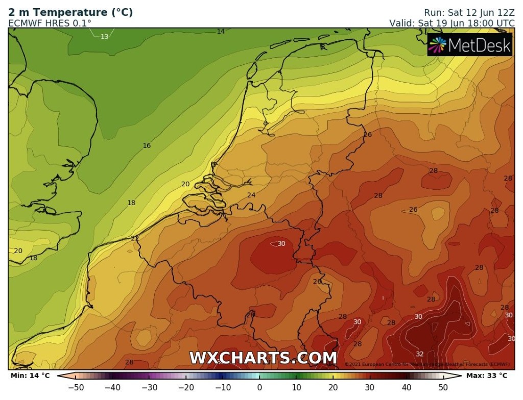 Het is maar de vraag op het westen en noorden veel van die warmte meekrijgen...